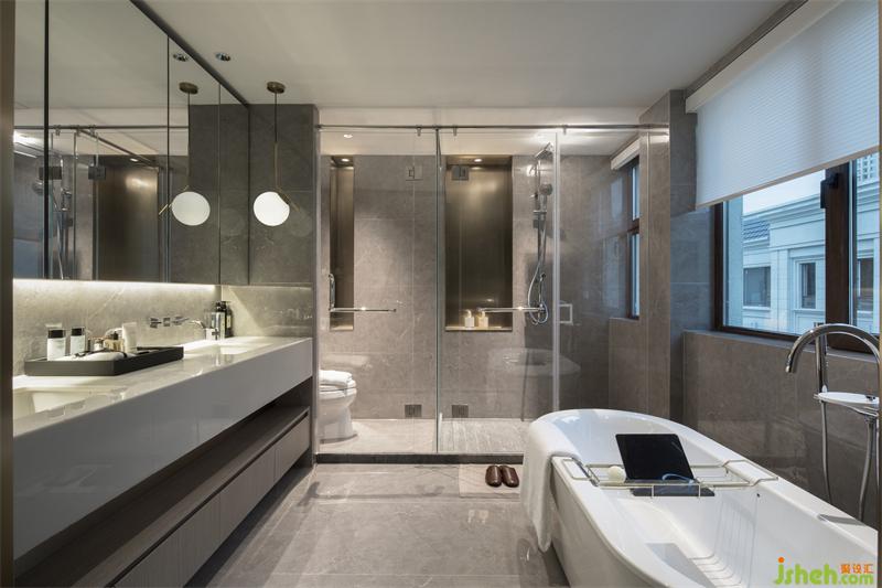 空间搭配上,浴室也绝不含糊。高级大气的沉稳灰色系,镜面与岩板相嵌,暖黄色灯具打破灰调沉闷,让空间展示精致摩登与沉稳经典的低调气质。