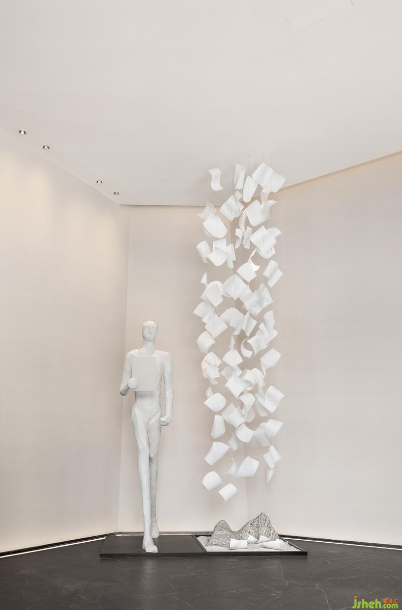 前厅的阅读主题艺术装置以纯粹的白色搭配悬浮造型,南宁售楼处设计以「飞行的书本」 般的空间剪影为器,与简约、静谧的入口形成统一语汇,传达着在空间游走者对于探索城市的无限遐想