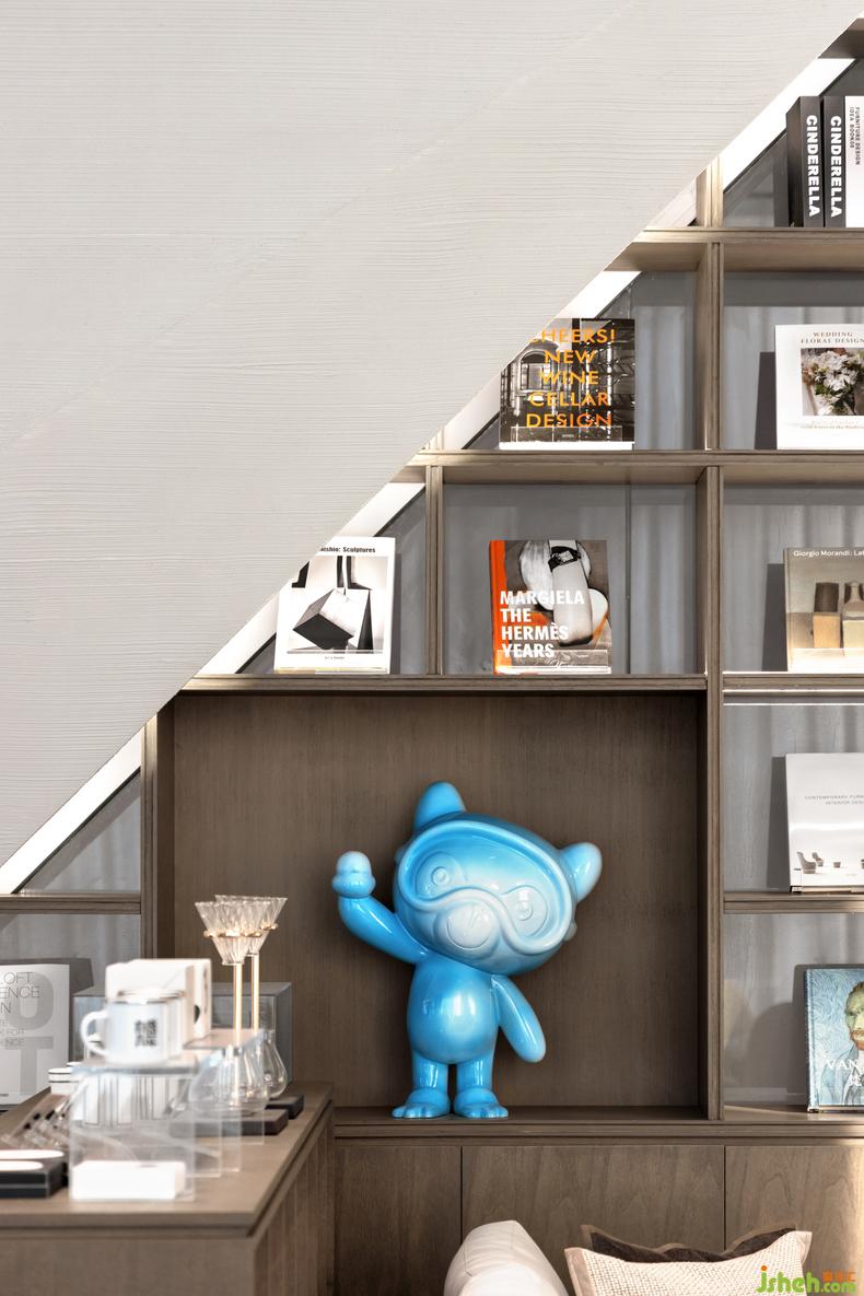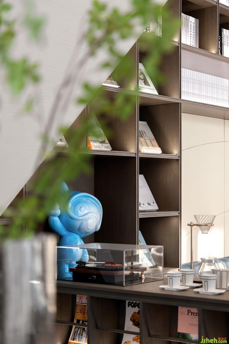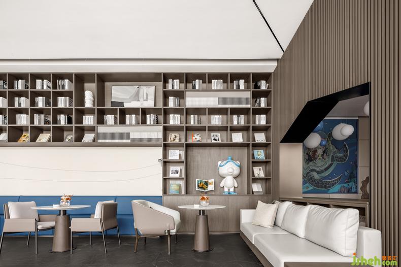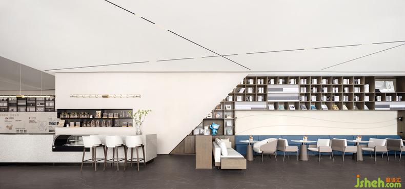 空间以灰与白之间的浅色色阶为基调,咖啡色作为书架底色,点缀蓝色自然的清新质感,打造敦厚温暖而不失活力的体验场景。