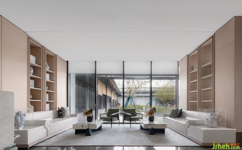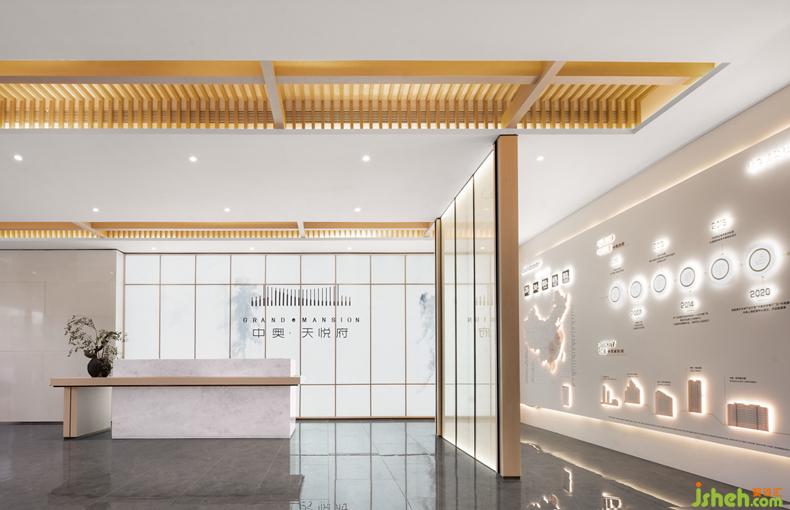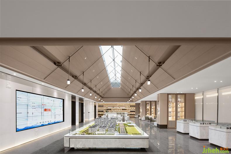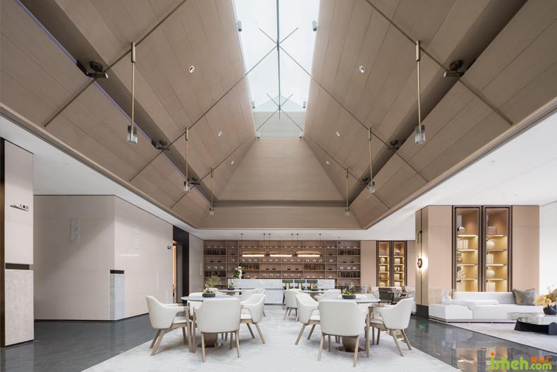 具有宋代建筑木结构艺术特点的前厅,提取当地千年学府“河洲书院”的设计元素进行拆解与重组,售楼处设计连结当地人文化基因的共鸣,运用现代的设计语言重现宋式美学。