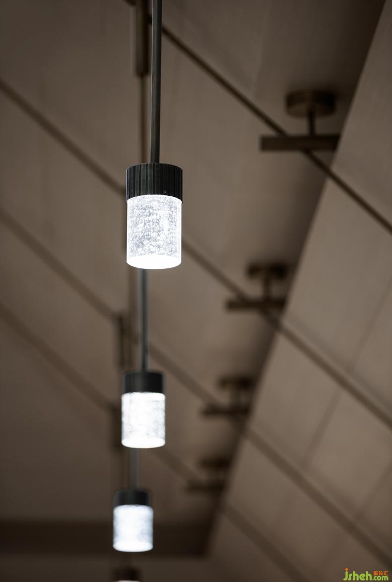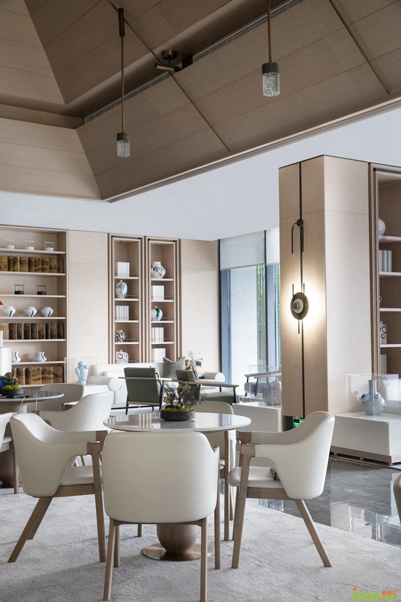 SUNS尚石设计在吊灯上将这一向往聚焦呈现,取松间挂满枝的实景图形,运用皎洁的白月光;售楼处设计自沙盘区起,逐个点照整个空间,格韵高洁、空灵澄净。
