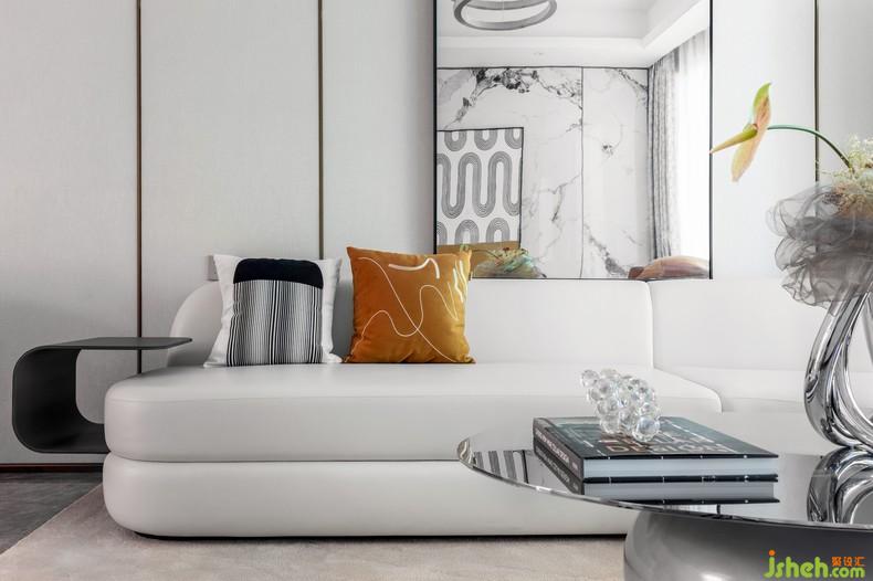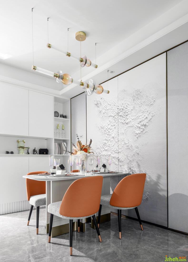 整体空间以静谧浅色调主色调,配以优雅和谐的橘黄色,加以金属色点缀;样板房设计个性和时尚传达至每一处,让空间有着多维艺术视角的生活感触。