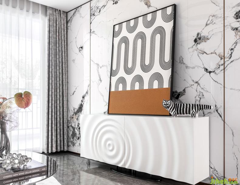 墙面装饰运用镜面和曲线挂画,增添空间中的趣味性。