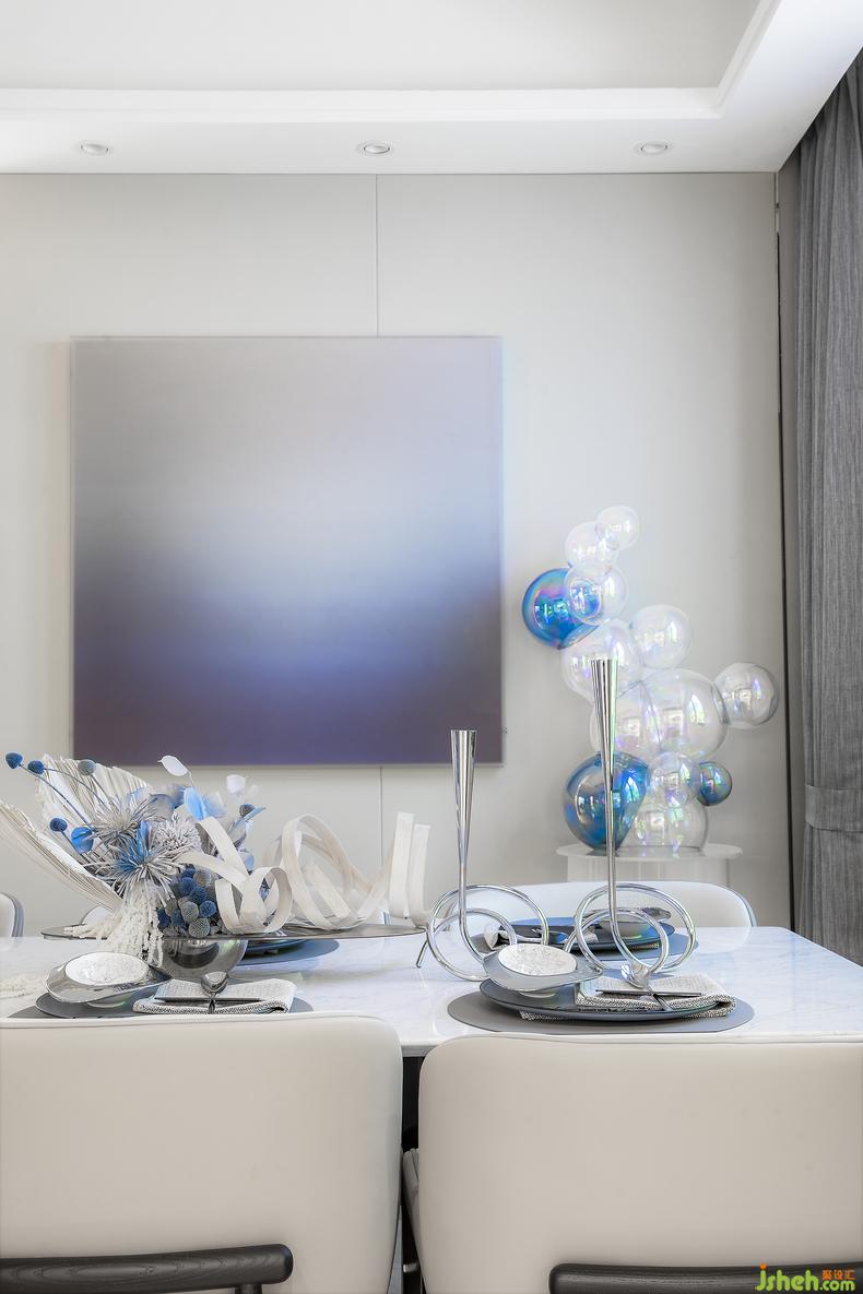 球型组合装置和渐变抽象挂画体现当代艺术审美,海蓝色彩与通过材质呈现的洁白让整个餐厅简约又不失灵动色彩。
