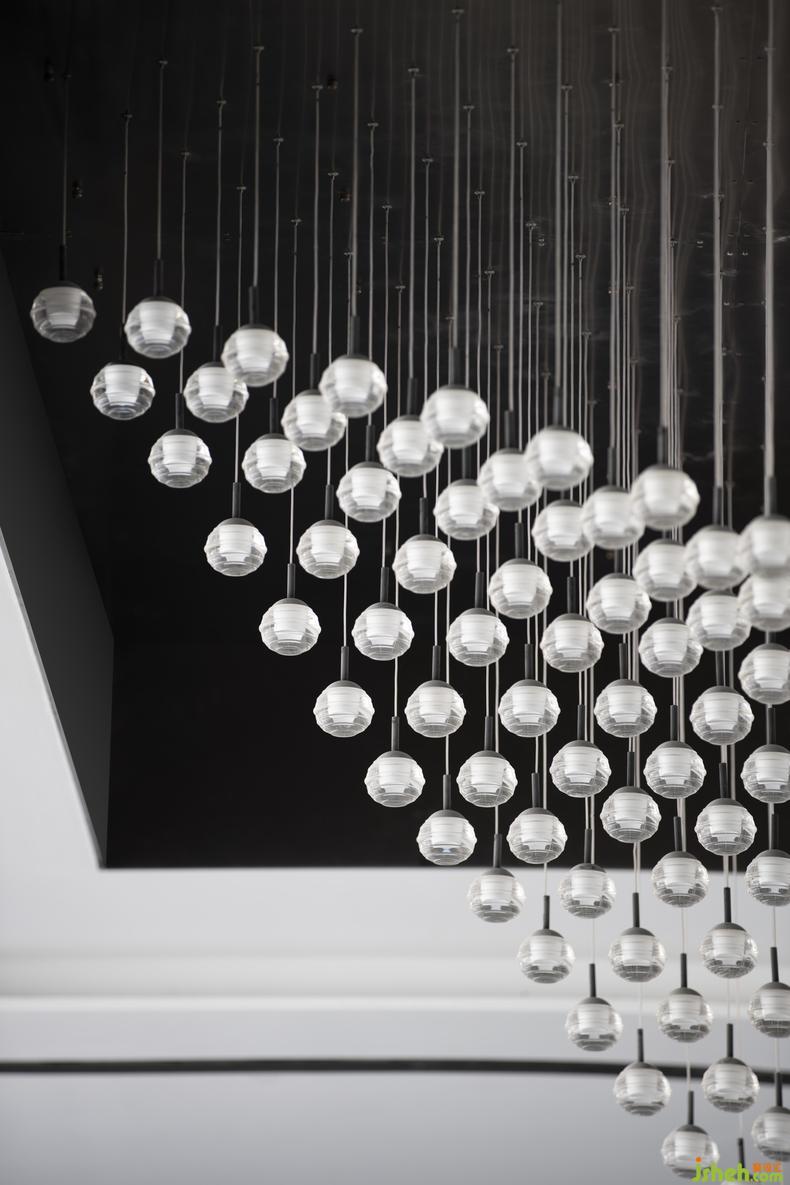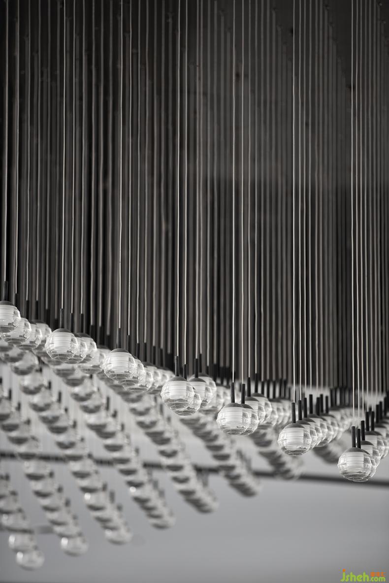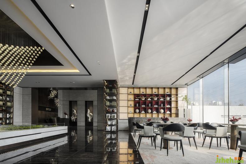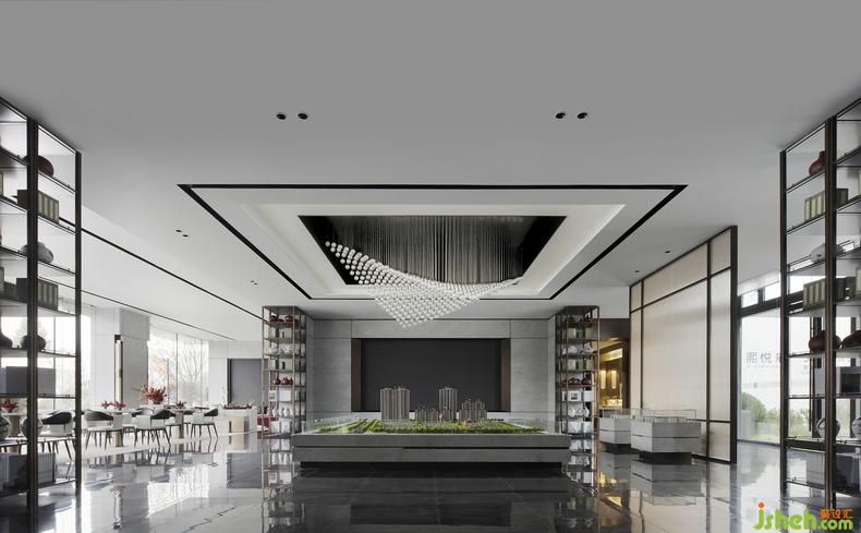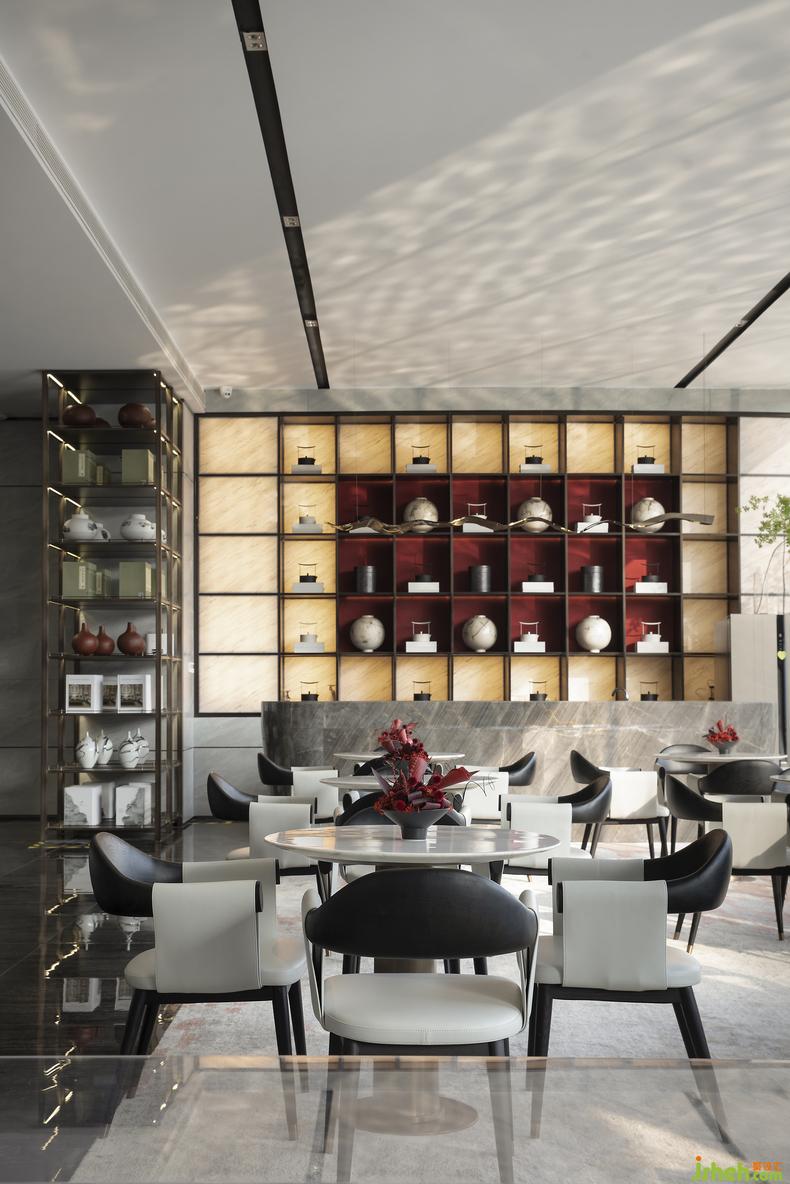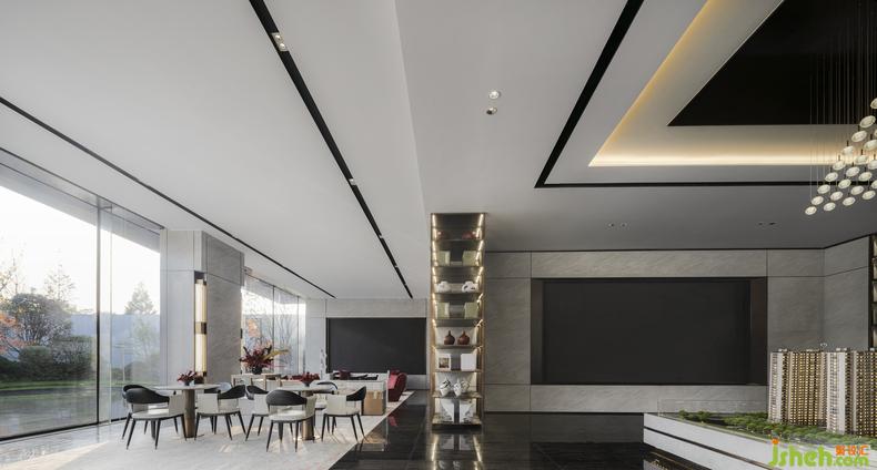水吧延续这份古韵,整个空间在灰白色调上点缀丹秫跟金属色,售楼处设计搭配出对比感极强的置物柜作为肌理分明的大理石吧台背景。而上方悬空的艺术灯饰如同浩荡水流,带着人们感受空间的韵律感,将那故事娓娓道来。