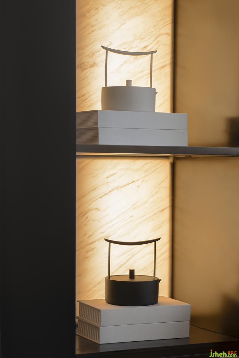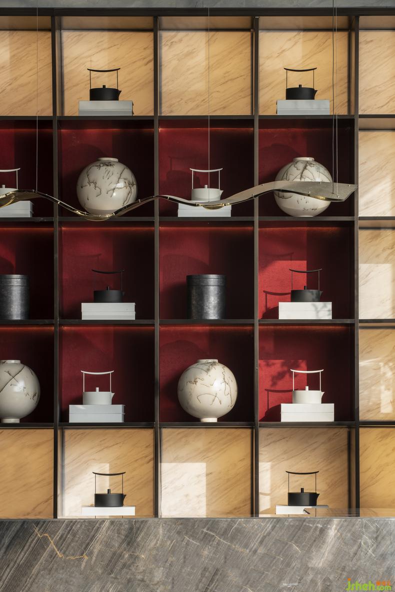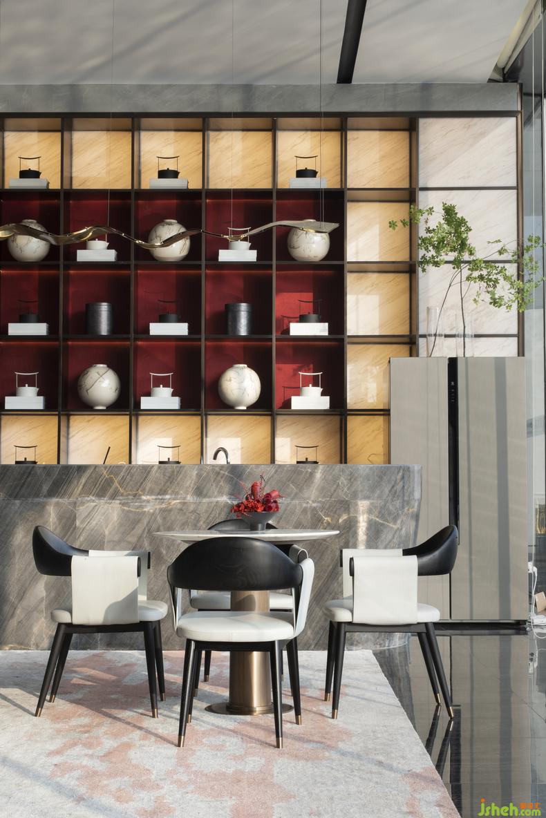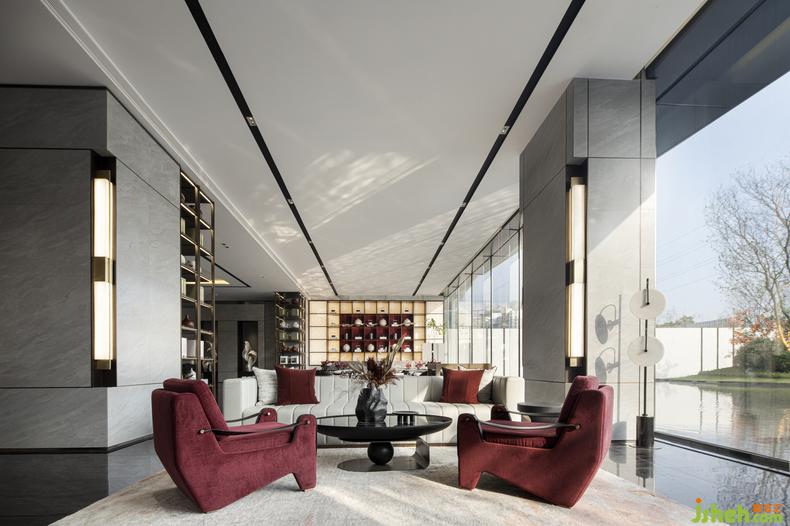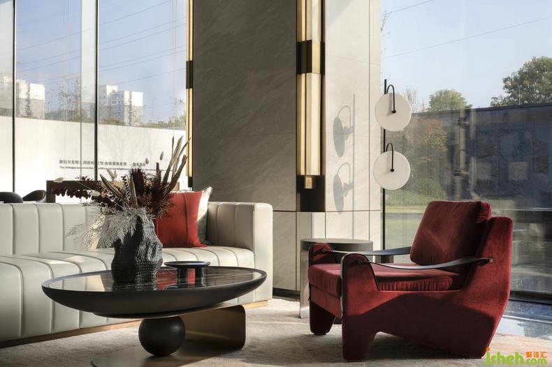 来到空间末端的深度洽谈区,深色墙面安静有力地坐落在尾端,透过错落有致的光影对比,售楼处设计营造更加私密的互动空间,于感官转化人们对空间场域的体验。