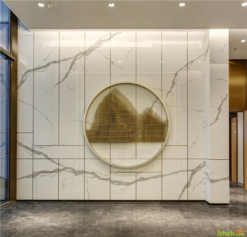 整体空间以:山· 水 · 茶 · 影作为设计的内涵主旨,首先进入的是前厅接待,整体体现是山水的黑白映画。大面灰色的石材地面,飘逸变化的山水纹墙面。配合极具装饰的现代几何接待吧台。在整面的拉丝仿古铜金属材质背景衬托“安康万达广场:的大字显得格外突出。但整体空间氛围艺术而干净。尽头那隐约富有禅意变化的景观。引入观者向内窥探的好奇感。别有心境。装修设计