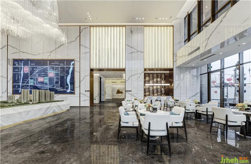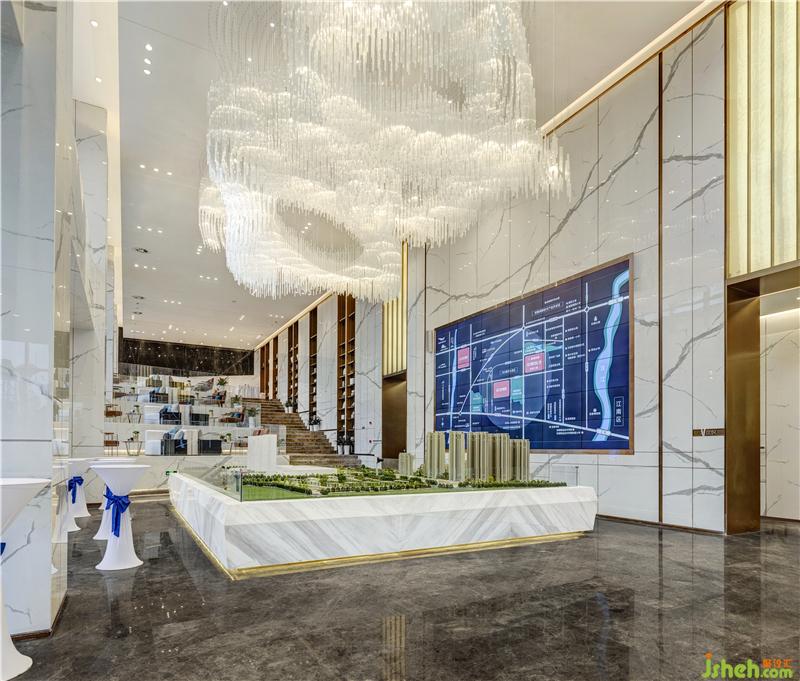 整体售楼大厅更是采用了戏剧化的设计。沙盘是舞台的焦点,整个洽谈区及精神书吧的阶梯空间更具剧场的美感。沙盘的上方是富有巴山,汉水的寓意的水晶灯,整个水晶灯由3万根水晶灯光组成,整体华丽富有变化,寓意美满。装修设计