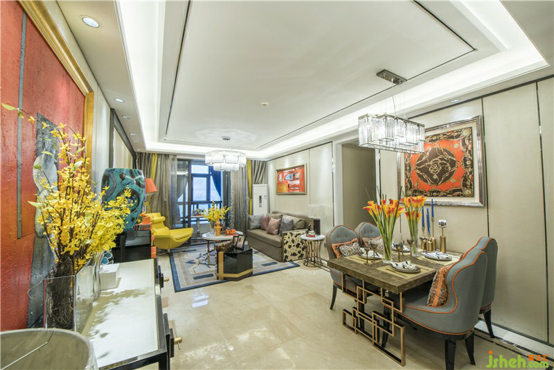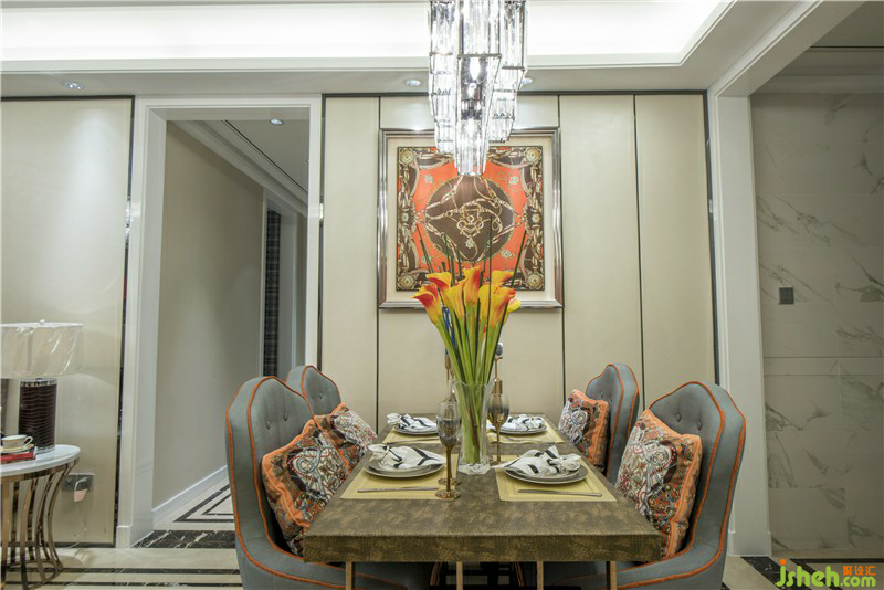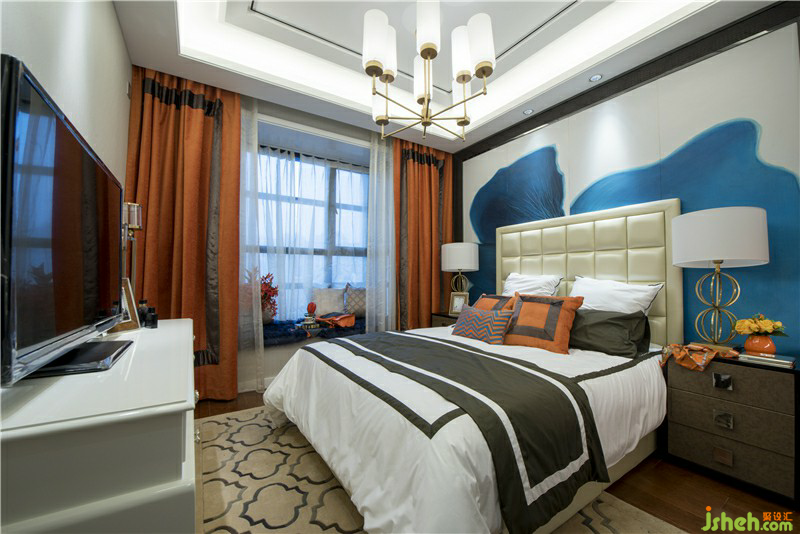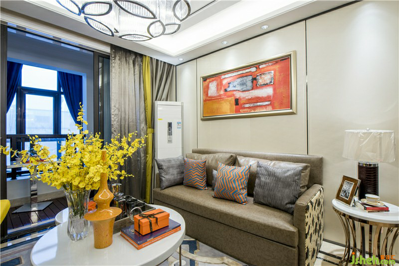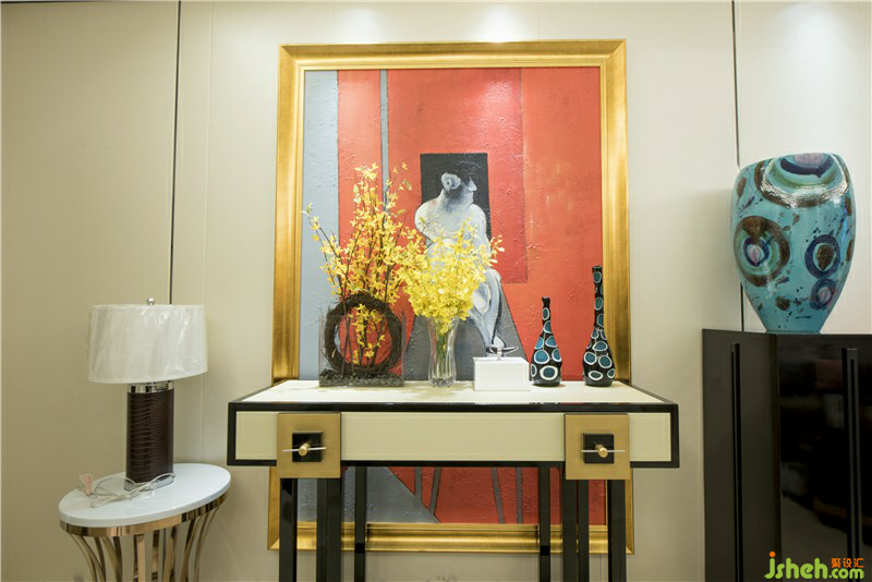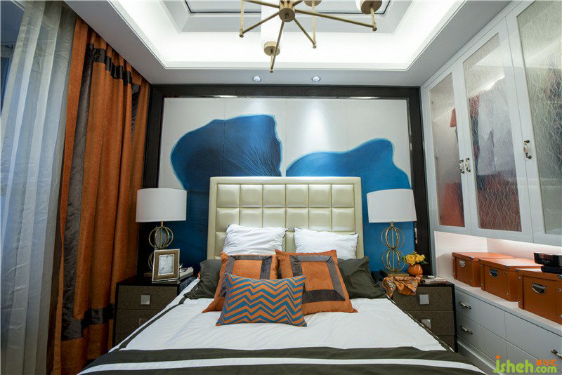 墙面大幅的艺术画布艺的墙面装饰简单不单调的造型都体现了作为服装设计师的主人独特的品位与艺术修养在暖暖的橙色里幸福满溢