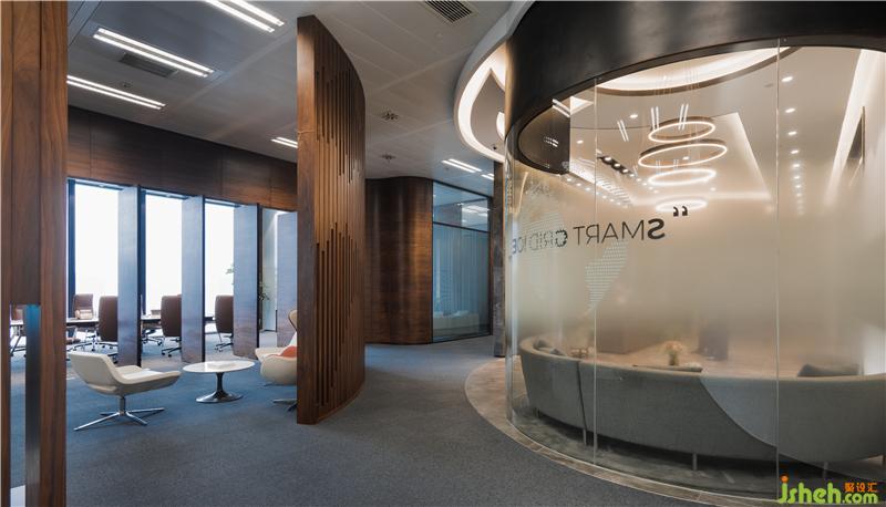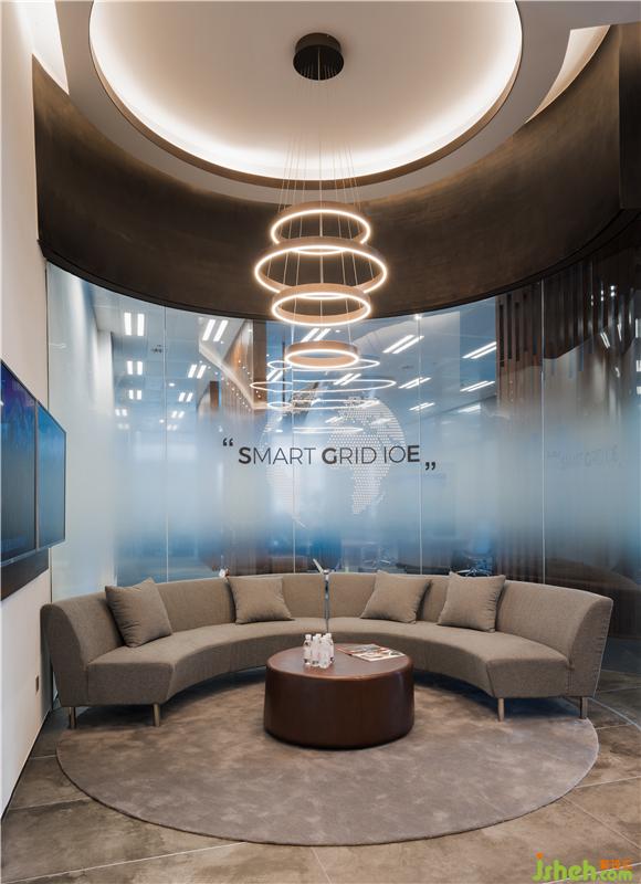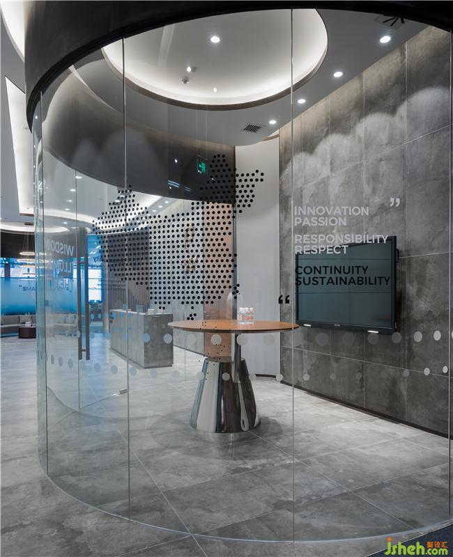 同时,两侧利用玻璃对部分空间做出分割,在光束的转换下,弱化掉石材所产生的压迫。等候区运用线条流畅的灯饰,进一步软化了边缘的界限。半开放式的布局让客户在等待的时候,也可以观赏到外界的风景。办公室设计