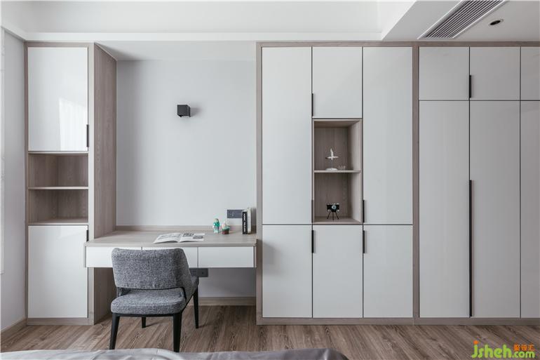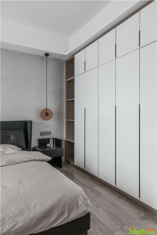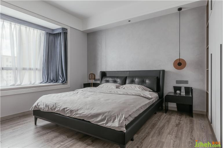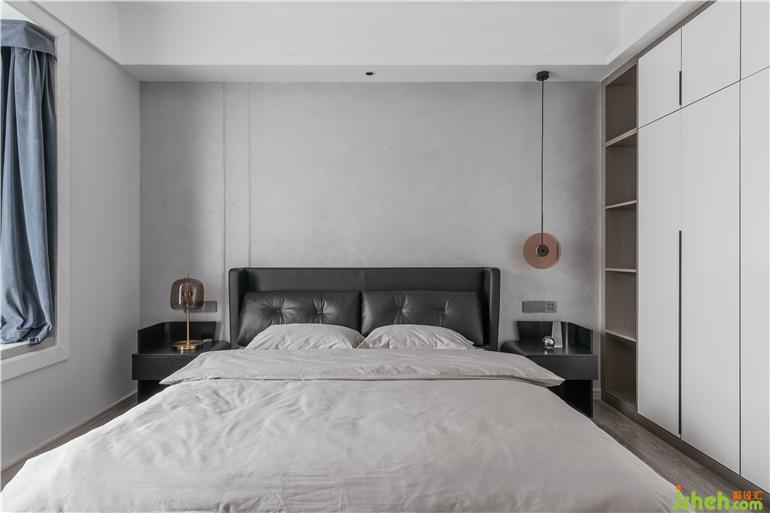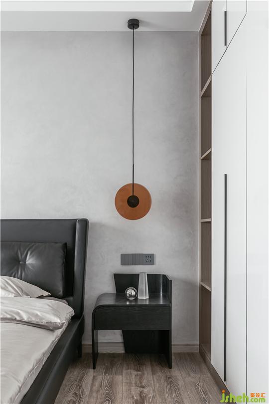 主卧暖灰色艺术漆做背景,让整个空间温润而有质感,艺术气息在整个空间畅游。