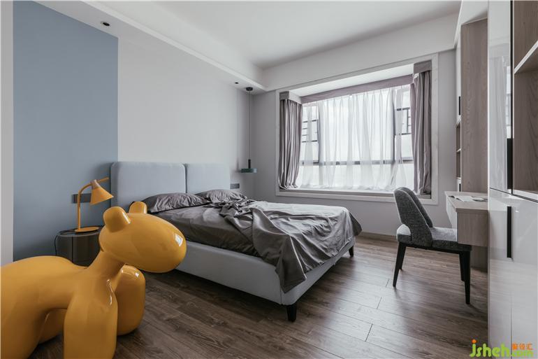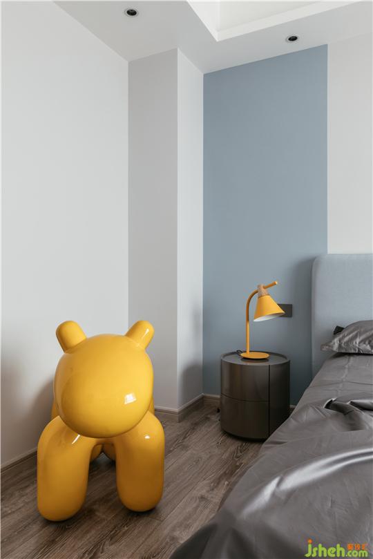 男孩房蓝灰拼色的墙面搭配同色系床,以及创意的网红座椅体现出空间的童真,使空间层次丰富而更有趣味。