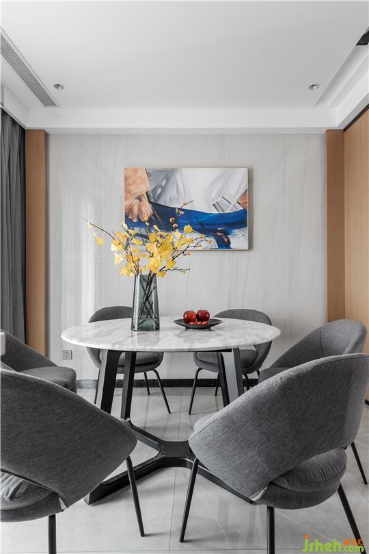 餐厅受户型局限,空间不大,于是在设计上我们做减法处理;无论是造型、天花空调的出风口还是无主灯的设计,都是为了空间在视觉上更加的规整、通透。