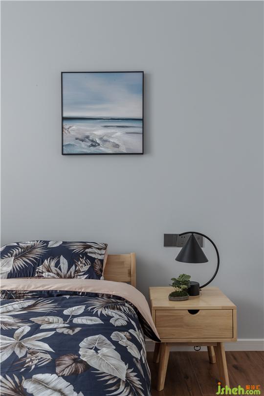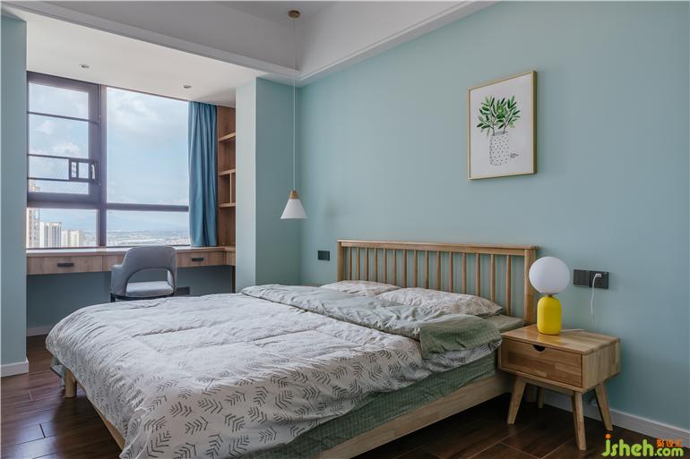 墙面选用Tiffany(蒂芙尼)蓝,床品、挂画延伸整个主题色,柠檬黄的台灯成了这个宁静空间跳动的音符。