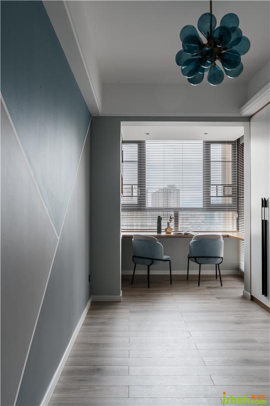 书房一开始设计的就满足了男主人”大大的书桌“的要求,面向花园的大窗,阳光从百叶中调皮的挤进来,这便是最美的风景。私宅设计不规则图案的磁力黑板墙,不仅是为了未来的宝宝,女主人偷偷透露的,这其实是眼前这个大男孩一直想要的。