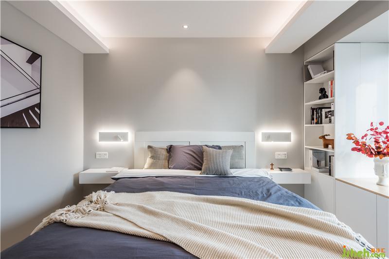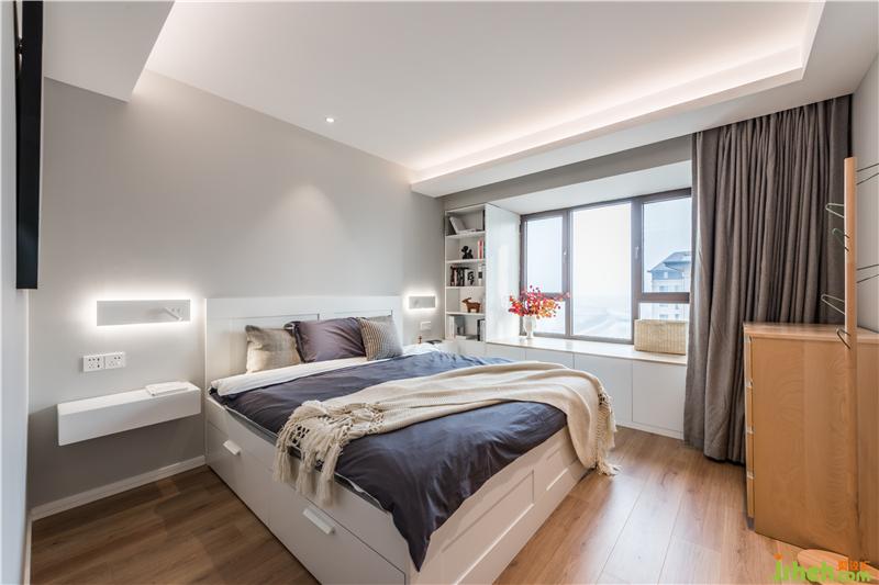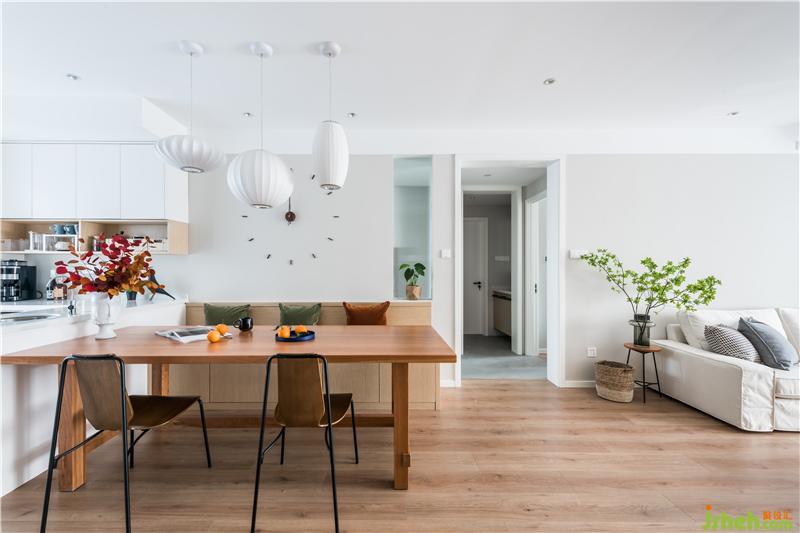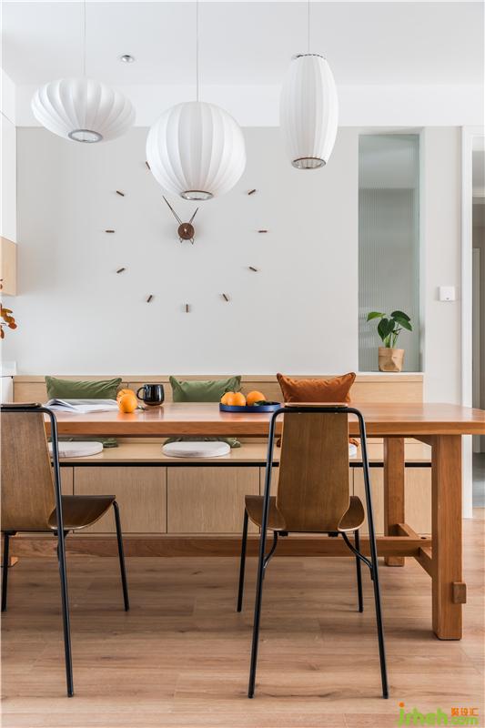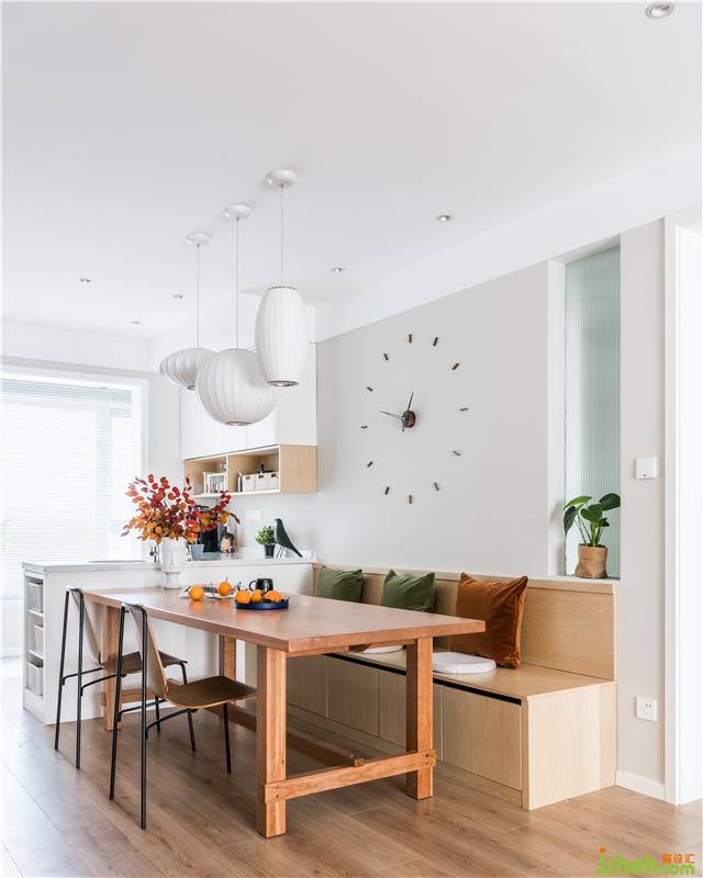 原来餐区有一个小阳台,那个位置门被拆除了,餐厅和中厨的空间变得更大。橱柜结合岛台设计解决了这里餐区空间的收纳问题,纯白的橱柜结合木地板给人一种干净舒服的感觉,家具色彩越是柔和视觉攻击力就越低,越能给人一种放松下来的居家氛围。