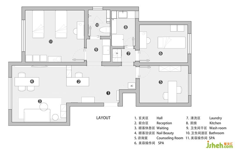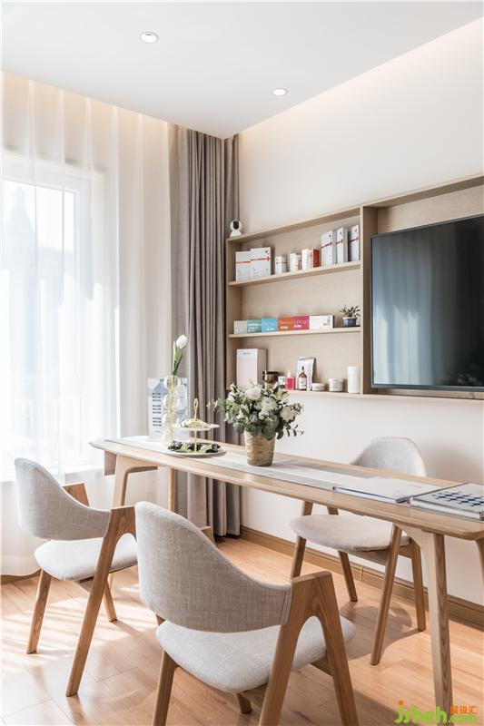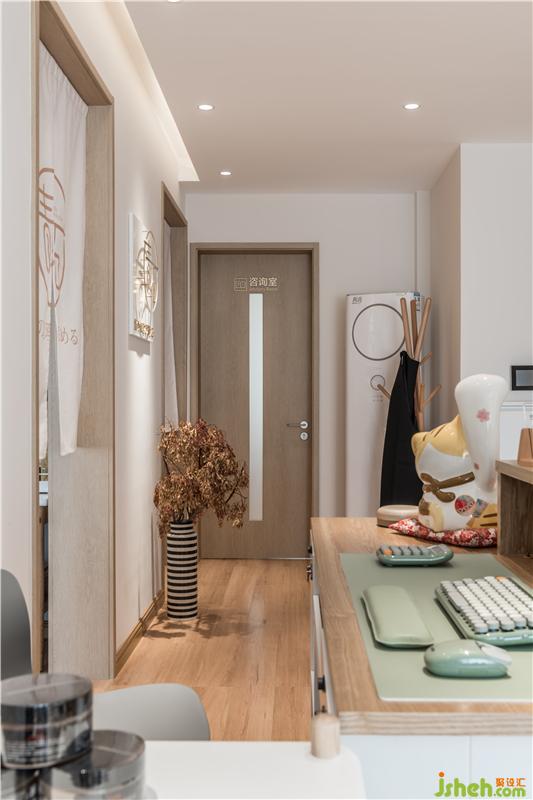 白色属于纯粹到极致的颜色,将干净柔和包裹在这个空间里。流畅开阔的空间里,缓缓打开一个属于纯粹、自然的空间。这个空间的“自然,素雅”,如女性内心里的世界一般,安静,流动变化,细腻丰富。以日系庭院作为设计灵感的“青石美容沙龙”,青石两字的涵义来自:日本庭院枯山水的概念,以石比喻山峦,以白沙比喻湖海,在这里静止的永恒美,和对美的想象共存。