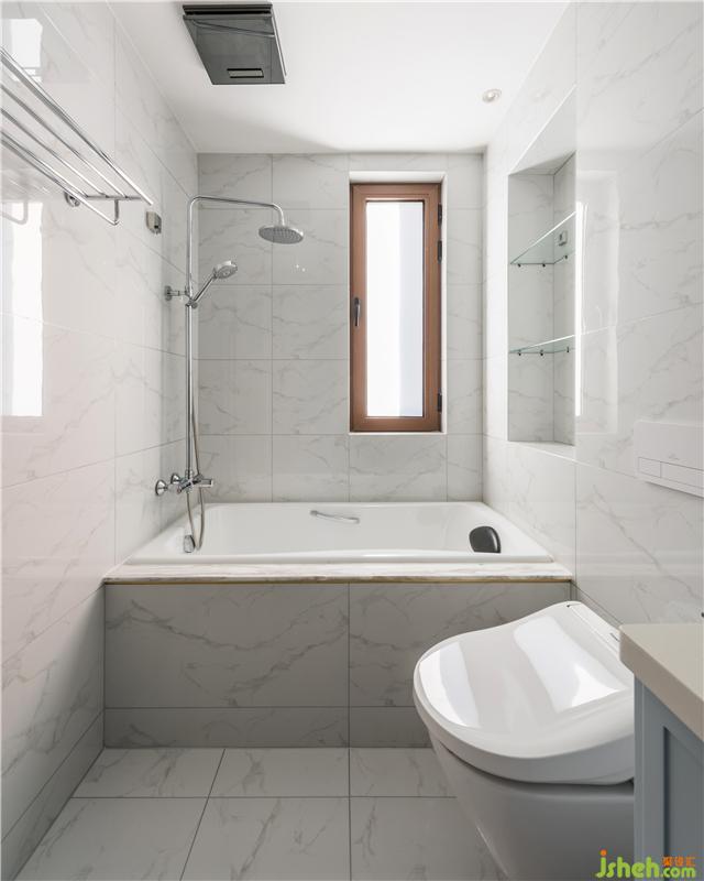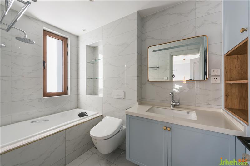 主卧洗手间不大 但是实现了浴缸和壁挂马桶的双设计