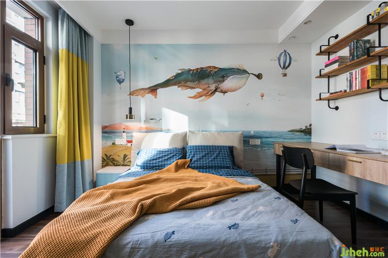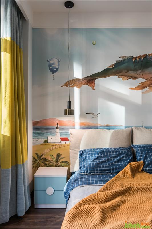 儿童房的墙面很吸睛 海面飞行的鲸鱼