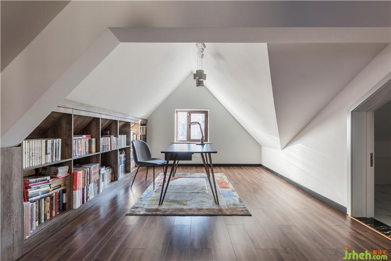 因为王哥职业的缘故,经常需要在家加班办公,所以我们把办公区安排在了三楼阁楼,借助位置优势能够拥有很好的独立性和安静环境,依据阁楼的异形特点,靠墙制作了超长的开放式收纳柜,高度适合随手取放,工作区作为书柜使用。