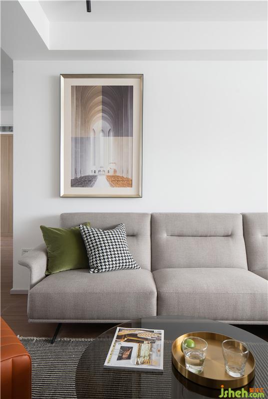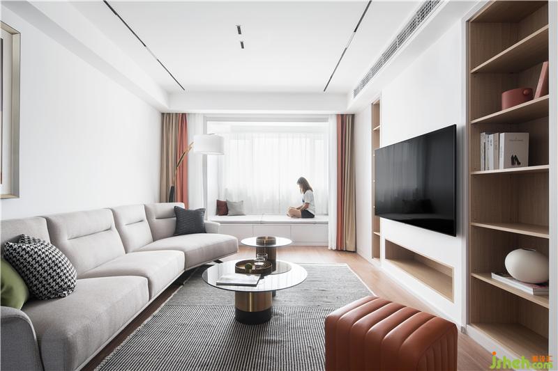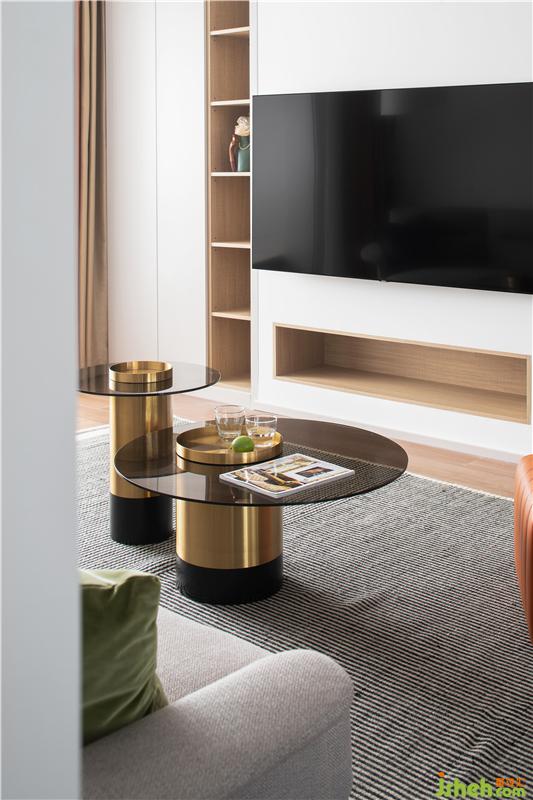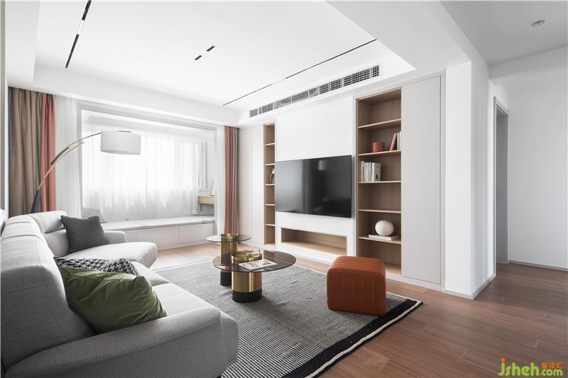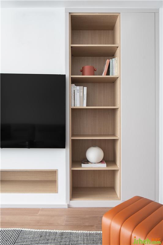 客厅,具有体块化的空间却拥有清爽宜人的配色,舒适的羊毛地毯给这里添了一丝懒洋洋的柔和。一个完全开敞的简约空间,纯白与木质让这里具有令人一下子沉静下来的魅力。继续沿用墙面收纳墙与开放书架结合,让收纳这件事拥有化整为零、仿若无物的功能。