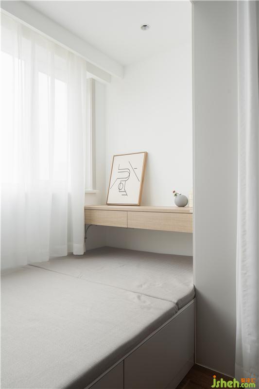扩大所有可利用的空间,原本的阳台被纳入客厅变成一个拥有阳光与微风的榻榻米,原木悬空柜子是一个实用细节,解决了更多喝茶、读书、储物的需求。拉上右侧的挂帘,这里也能作为半开放的客卧使用,功能满满。——这是这个家的第二重「折叠」