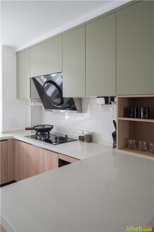 打开厨房的联动门,扑面而来是抹茶绿的清新,U型橱柜布局在有限空间里实现了更多的操作空间。设计师选用原木与抹茶绿的色调,带来属于森林的密语,在这个空间,烹饪顿时变成了一个愉悦享受的过程。