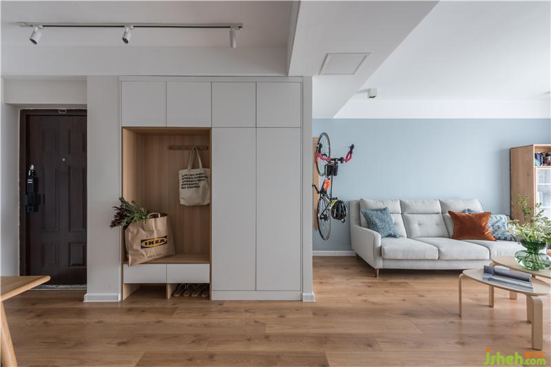 房子原本是没有空间留给玄关收纳的,我们通过一组特别定制的柜子,入户不仅可以收纳鞋子衣物,还能让小朋友,大人归家之后,有个位置坐下能轻轻呼一口气,不着急慢慢换鞋。