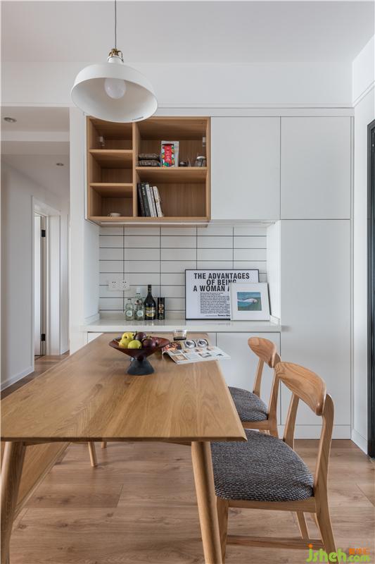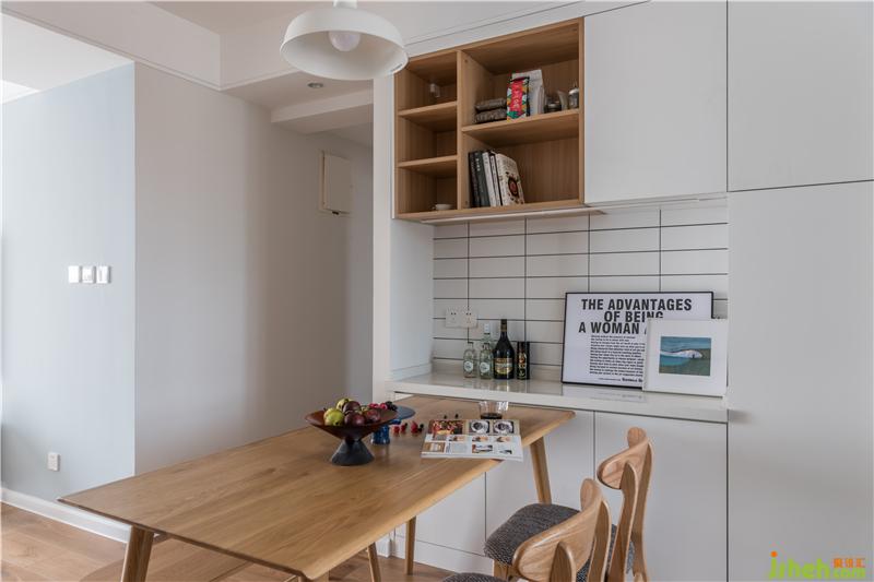 1、避开入户无玄关收纳的尴尬,一面墙柜作为收纳,餐厅则实现西厨+用餐区的组合;
