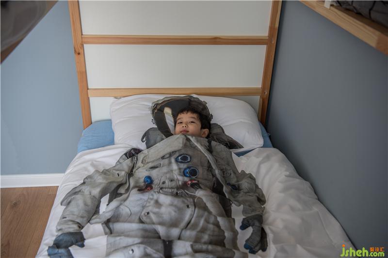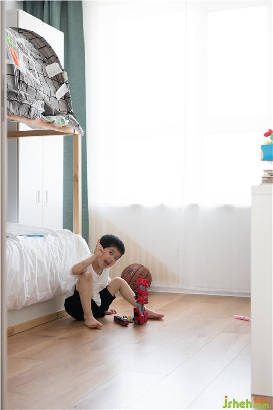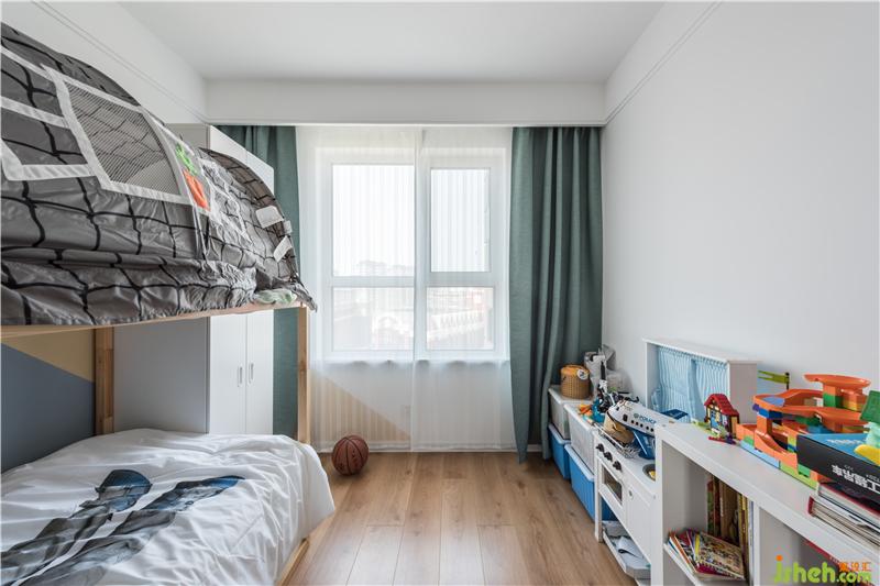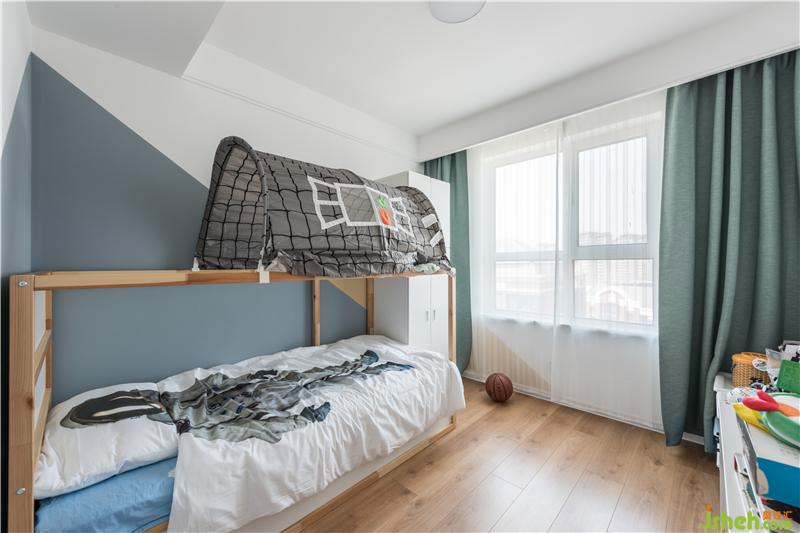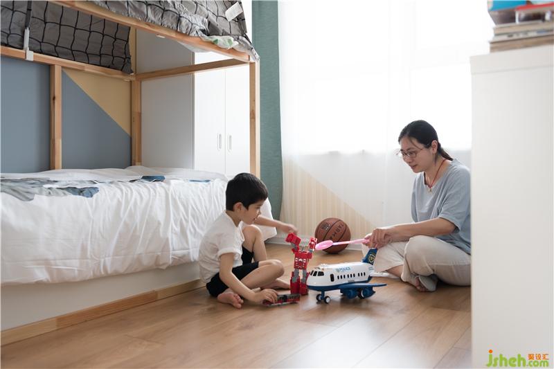 一个有趣的床,加上不普通的拼色墙让这个空间一下子有了色彩。这里的互动空间也可以随着孩子的长大,随时更换家具单品来做崭新的功能布局。