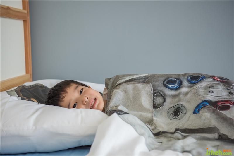 睡在床上的孩子,甜甜的笑容很治愈,被套是爸爸给孩子特意准备的电影同款。