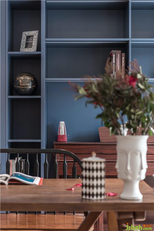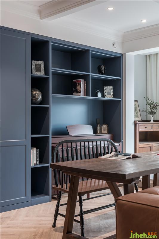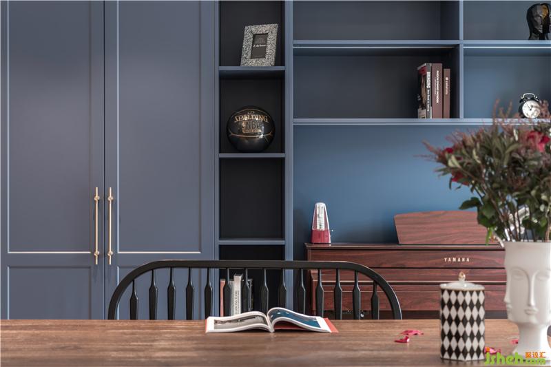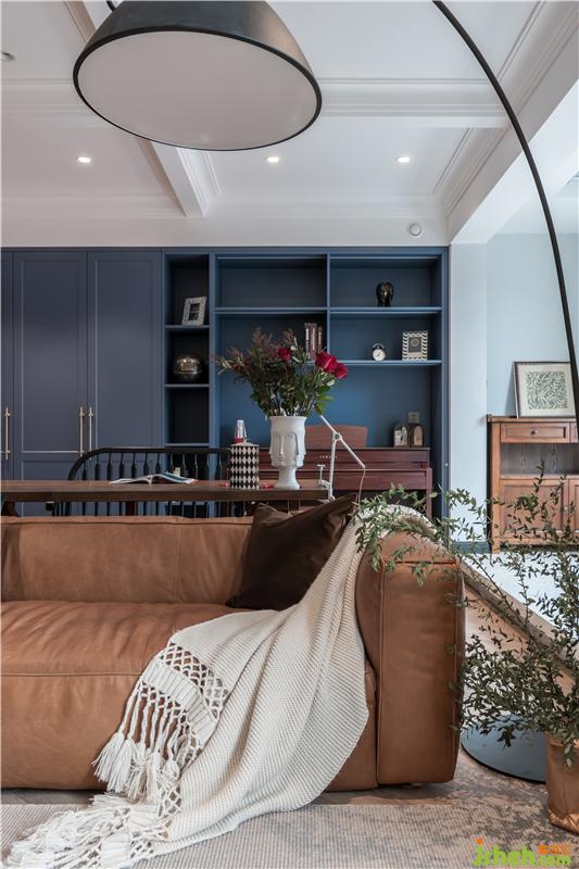 屋主M喜欢复古、轻松的氛围,一楼空间主色调通过深棕皮质沙发+复古蓝柜面,天津别墅设计搭配造型复古的精致摆件,深色的木质带来怀旧的气质。屋主一家人在家的时间比较多,希望家可以很温暖,充满包容,同时又可以时换时新,不然没住多久就看腻了。