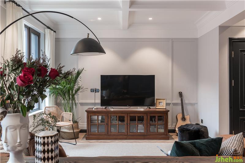 整面背景墙横贯客厅,天津别墅设计开放格和隐蔽柜门的组合,物品收纳井然有序,既可以摆放屋主精心收藏的工艺品,又可以把孩子的物品、玩具都收纳在内,隐藏起来。