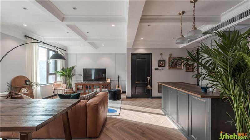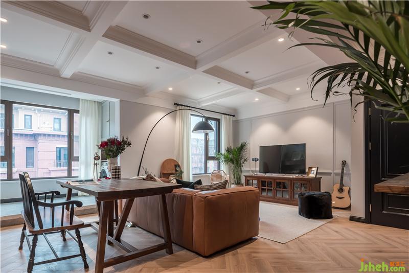 站在书房的角度看客厅,人字拼地板与深灰色的搭配,空间主色调十分柔和,复古又精致。