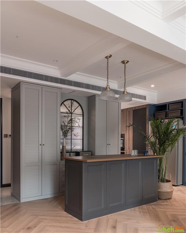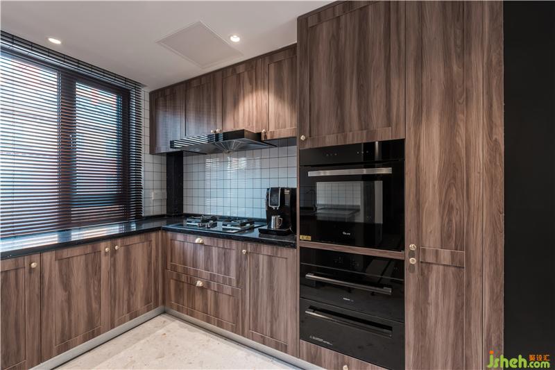 橱柜的纹理特别选用了这种木质纹理,深色纹理搭配纯黑台面,显得十分高级,搭配清新的小白砖和水磨石地面,厨房颜色有主有次。纯黑百叶帘的选择为空间带来了协调一致的美感。