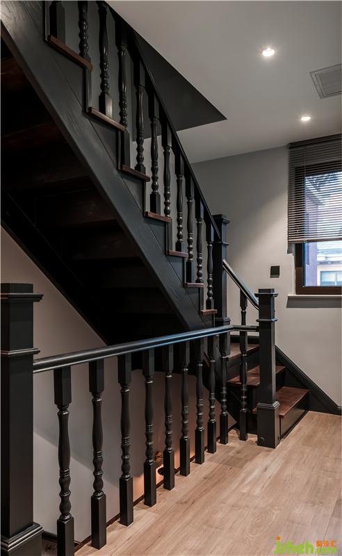 实木楼梯,全部都是深色系,展现古典式的优雅,有扶手对于小孩子来说是一个更安全的选择。整个房间一共有三层,一层是客厅等公区,二层是主人的卧室们和书房,三楼是一个小阁楼暂时作为储藏间。
