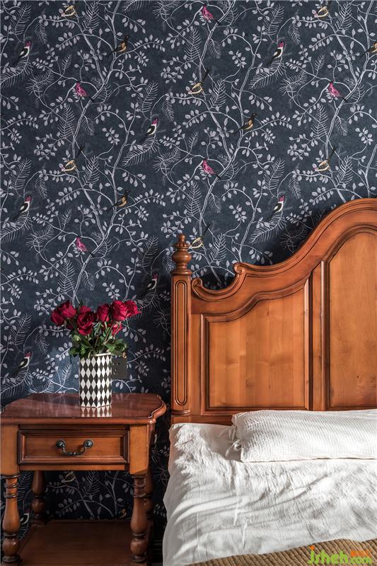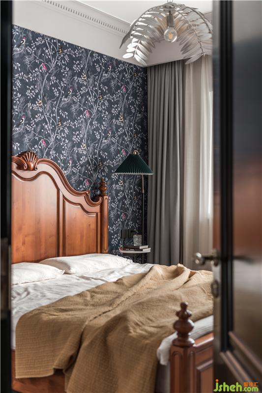 主卧最亮眼的颜色是背景墙,使用定制壁画,深蓝色的枝叶与数只小鸟,活泼优雅,纹理质感极好。与主卧的床搭配,天津别墅设计属于复古的调性优雅蔓延。主卧的收纳都隐蔽在没拍到的另一面收纳墙里。