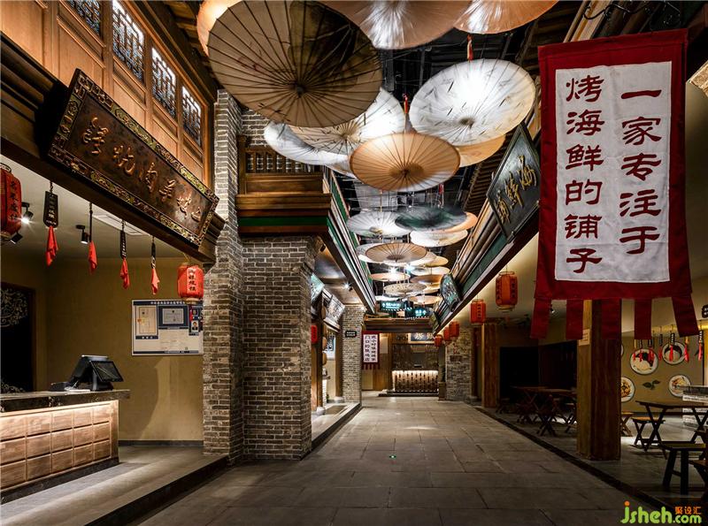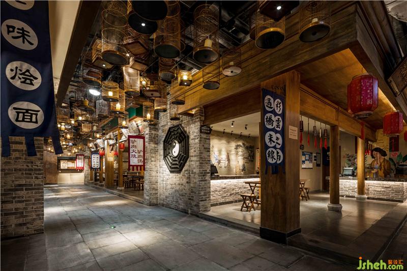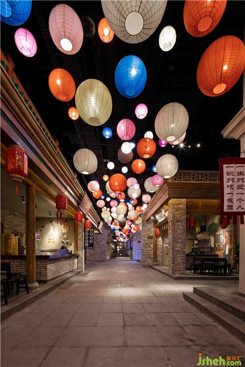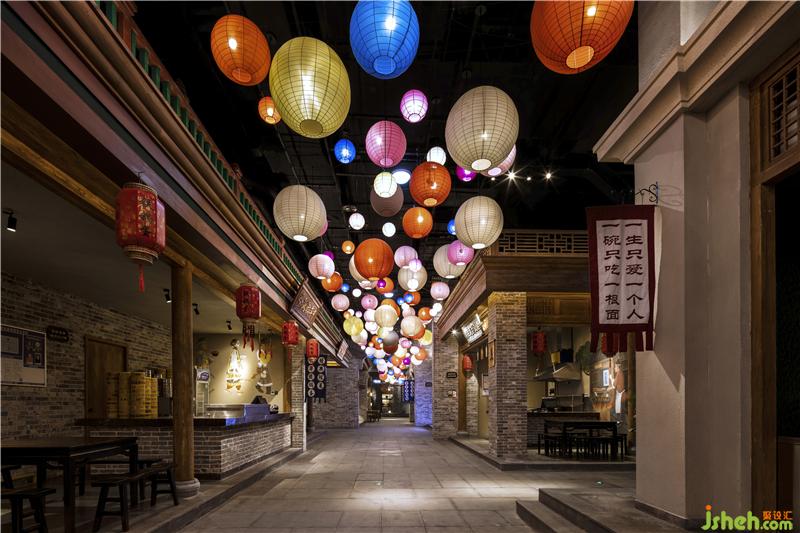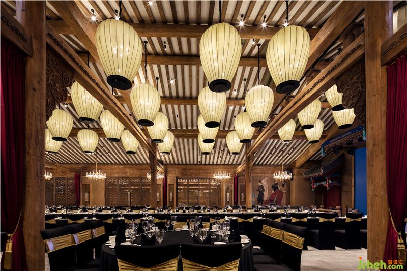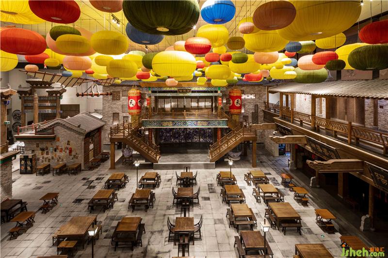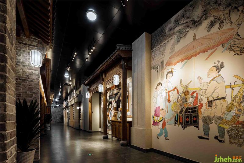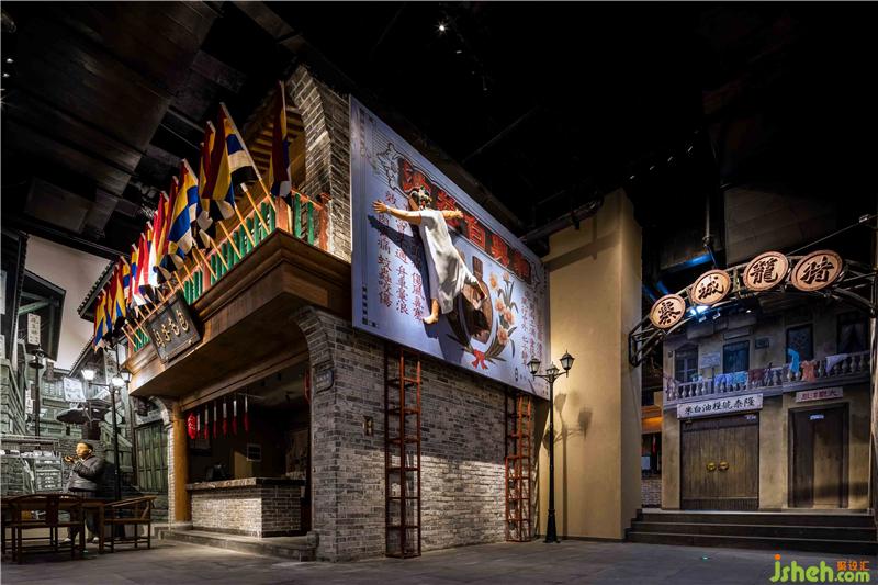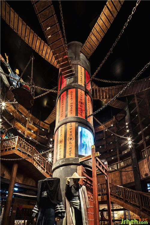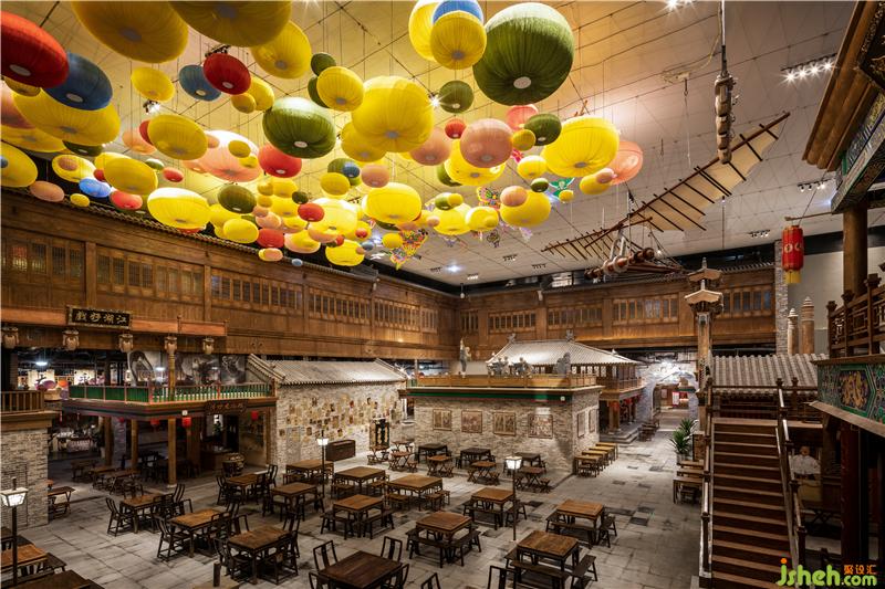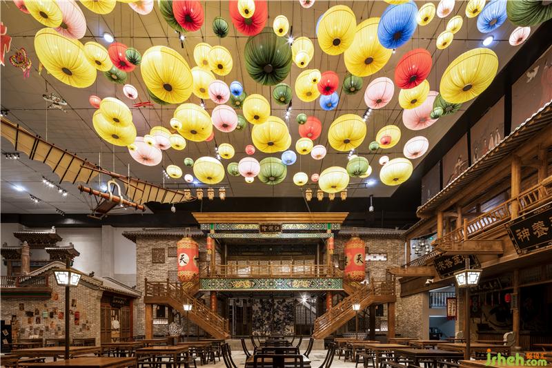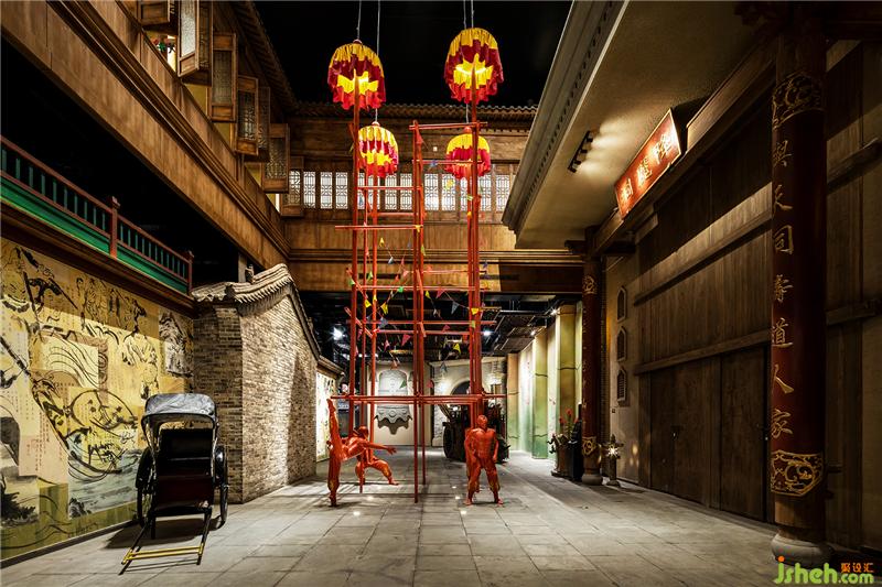 在一楼散厅、灯笼街等区域,我们大胆地运用了丰富的色彩来表现空间,从而打破了以往古城古建给人的传统印象,使空间在讲述历史文化的同时,更具有特色和张力,成为了游客的记忆焦点。对于硬装没有考虑到的一些墙面和空间,我们结合电影场景,采用了原创墙绘等形式,既弥补了硬装细节上的不足,又创造出了气势恢宏的剧场效果。