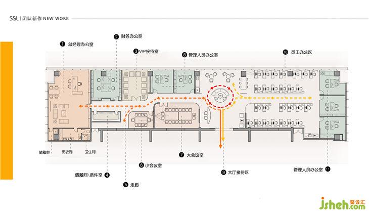 结合该企业的历史背景以及它的企业文化,设计师对内部的狭长空间重新设计,使其充分满足了一个50人企业的的功能需求。