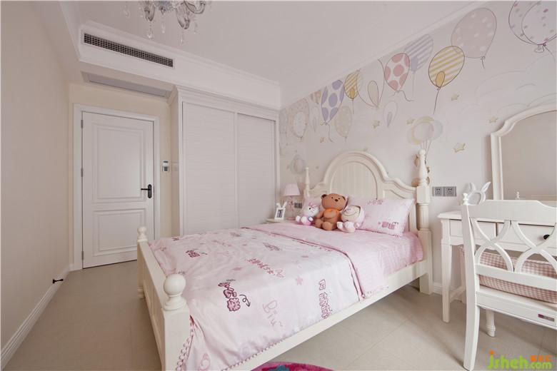 女孩房-粉色总是给人幸福活泼的感觉,床头的背景墙布释放出儿童的天真与可爱。书桌旁的飘窗增加了书架层板,飘窗装饰成小公主接待小客人的空间,也可以是温情的亲子空间。