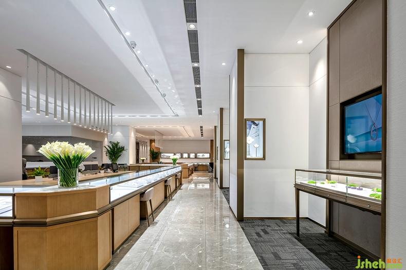 作为珠宝展示区的入口,接待前厅延续简约时尚,低调奢华的设计手法,原木的柔和减弱了石材的硬朗与金属的冰冷感。