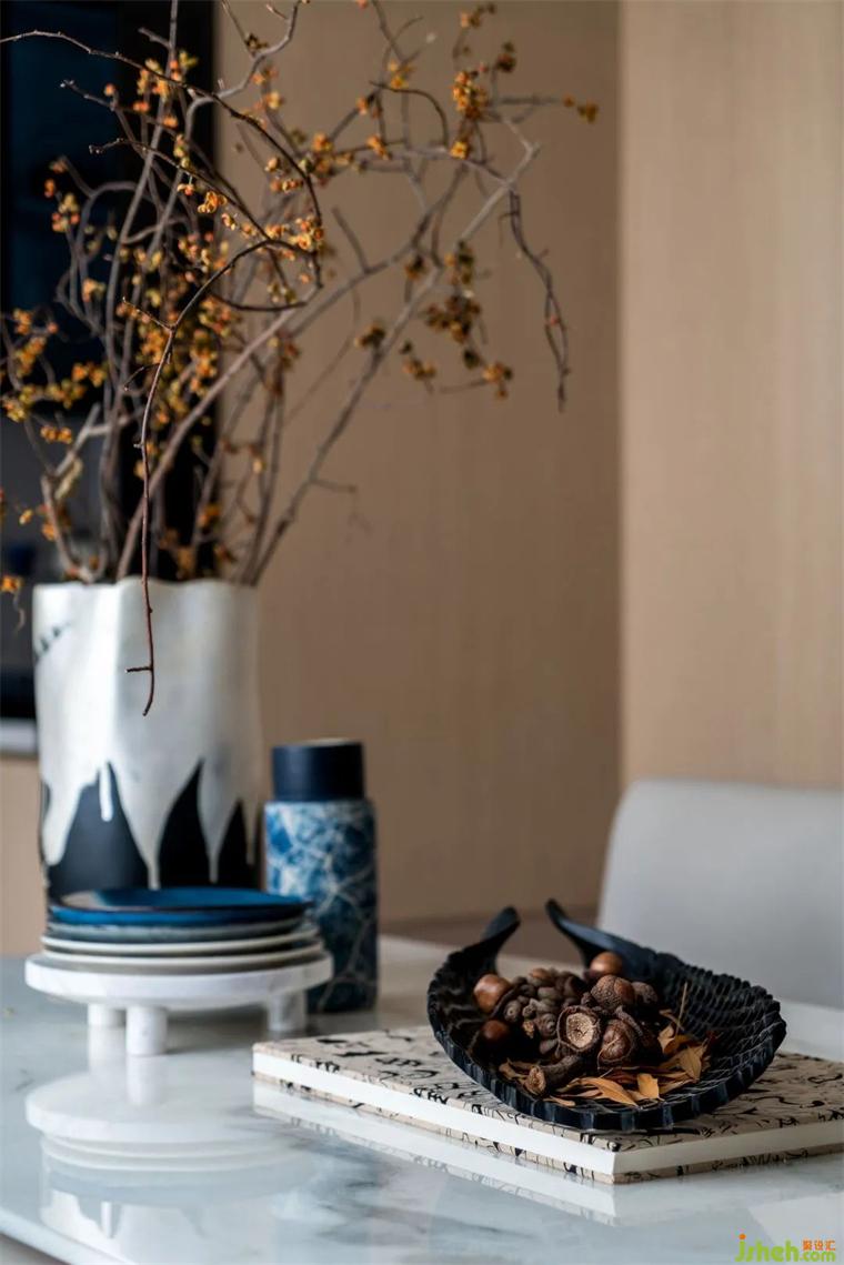 以青绿釉陶瓷为墨、样板房设计以金色灯具为墨、以枯黄枝桠为墨、以缎面艺术丝带为墨。