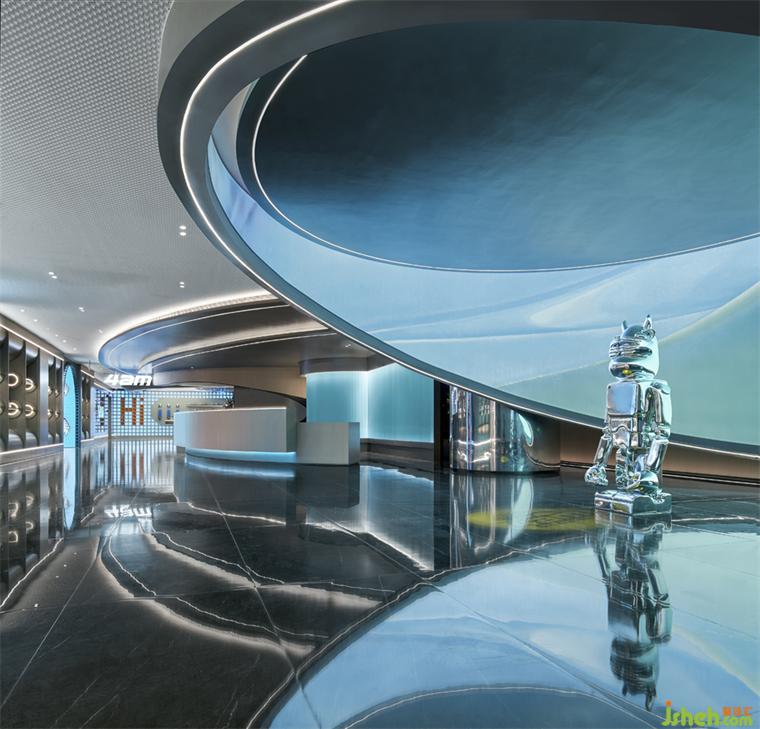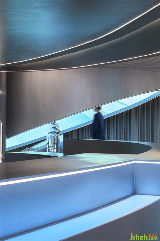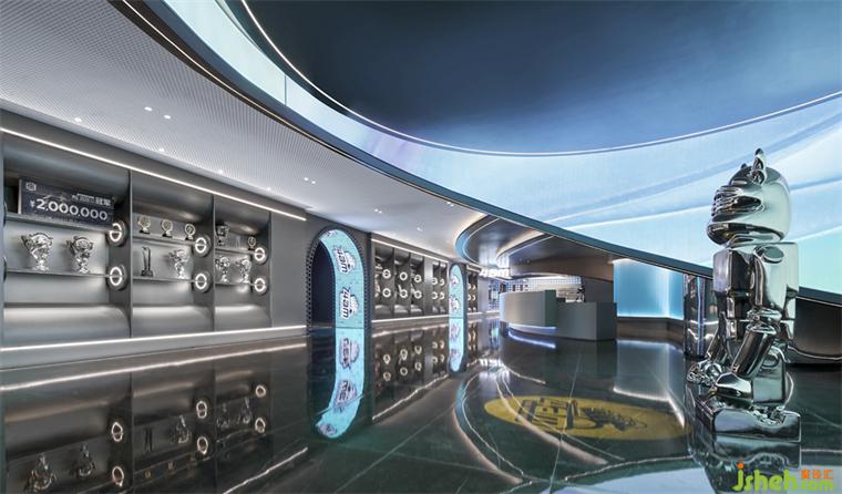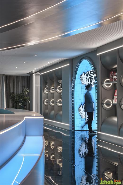 跟着动线游动,一个大体量的圆弧形品牌展示区游离在空间中,冠军奖牌名誉展示柜见证了过往的荣光,多弧形设计让人产生无限遐想,璀璨的银白星空在低语,电竞俱乐部设计与宇宙蓝交织、碰撞。