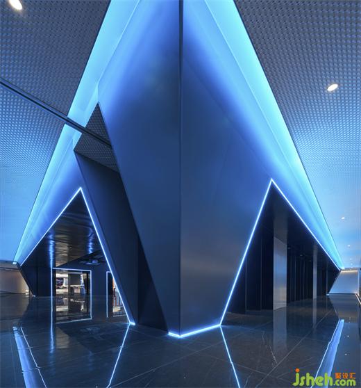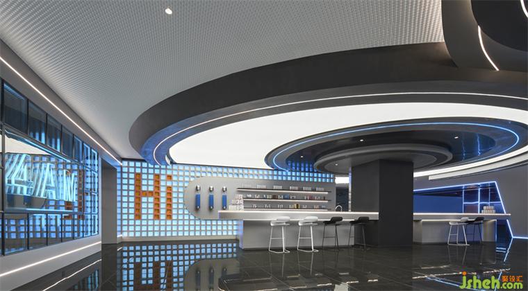 斜面的大型盒子如装置一样座立在空间上,电竞俱乐部设计靛蓝色的极光穿梭在空间之中,就像生活在未来的赛博朋克世界。