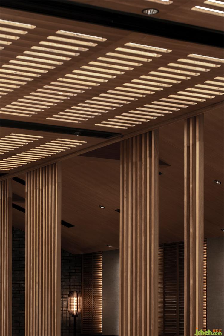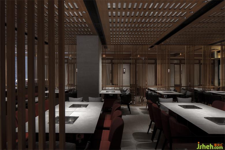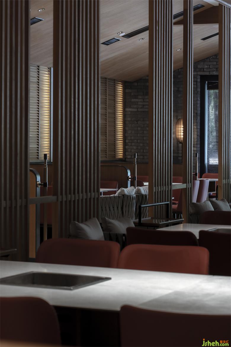 大厅木格栅左右两边,成都餐厅设计了不同形式的就餐空间,左侧为卡座区,使用与大厅材质统一、形态各异的木质隔断,打造丰富变化的用餐环。