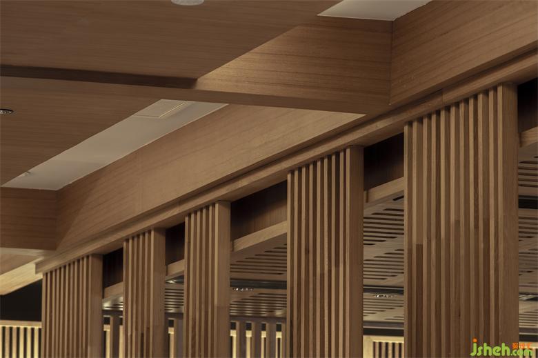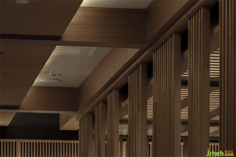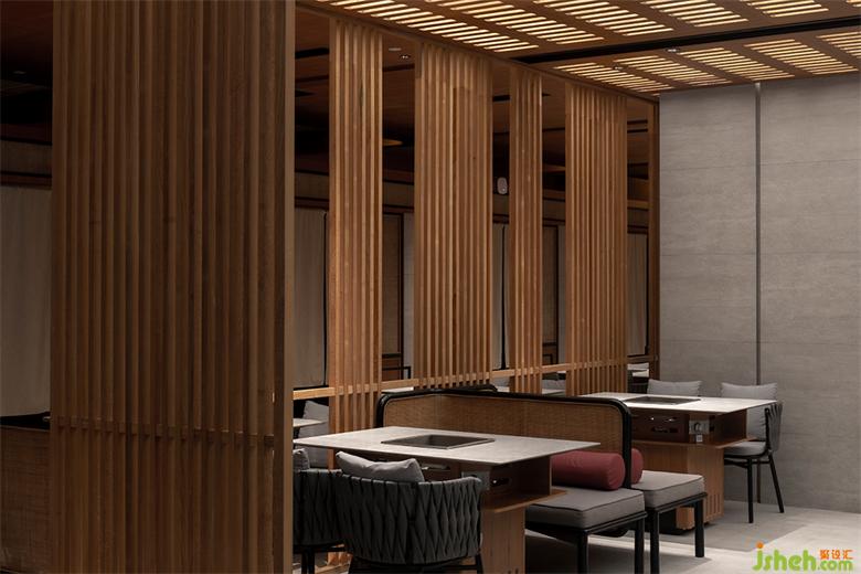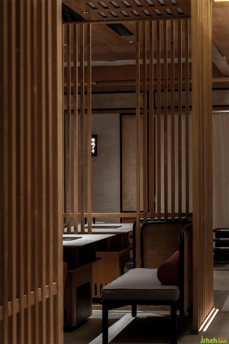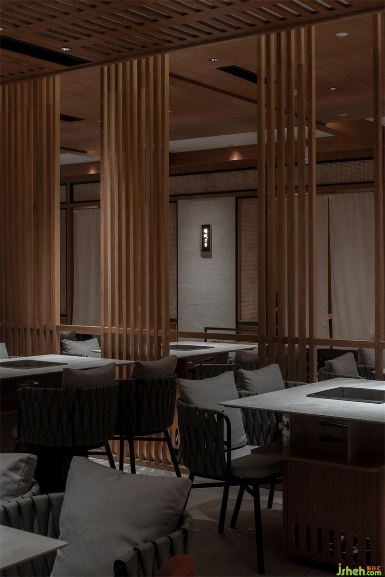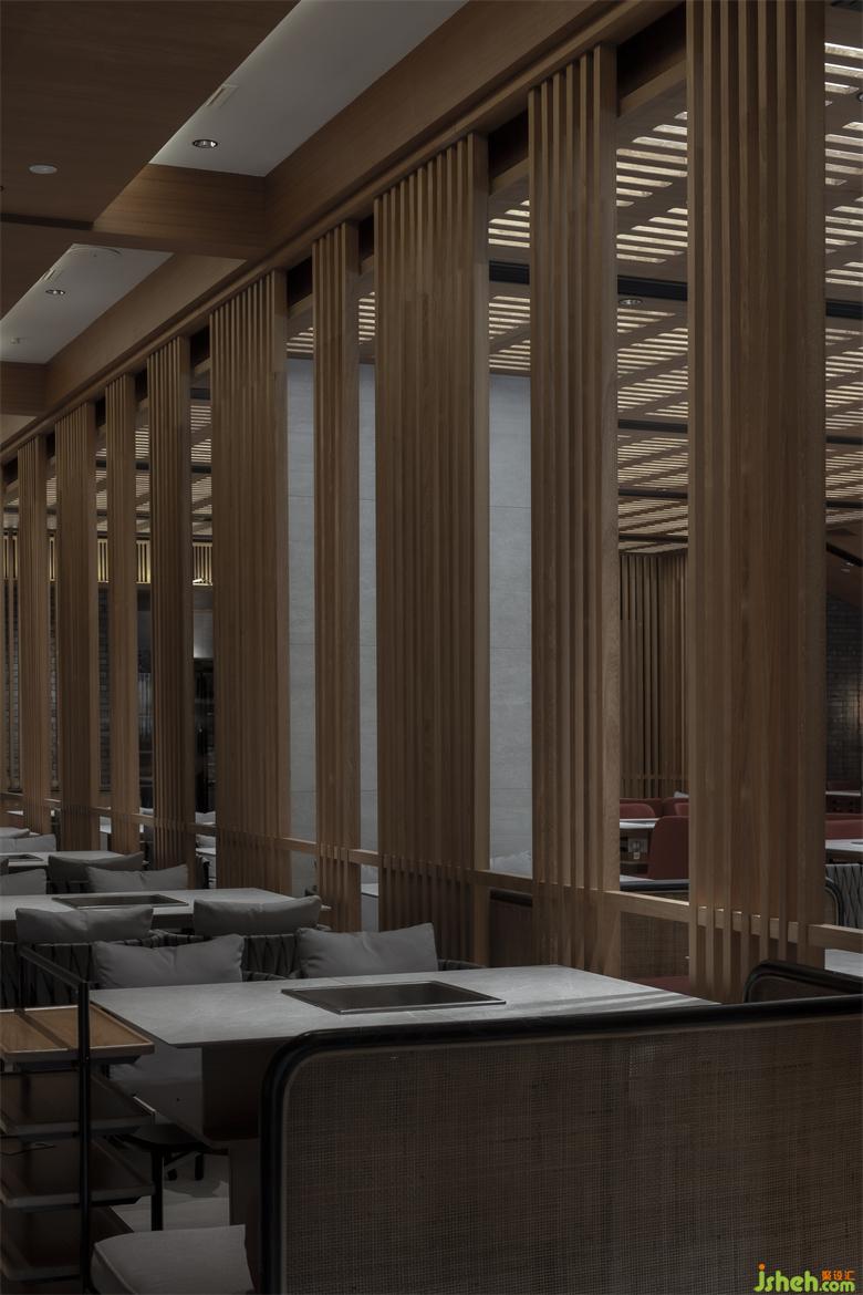 保留特色同时也要满足推陈出新的目的,融入年轻新潮的氛围。看似密集的木格栅,采用了「空间顶面透光」的手法,打造光与影的意境。成都餐厅设计格栅顶部透光方式将光线引入,漫散的光影,使空间层次渲染丰富。火锅热闹的氛围中,融入光影动势,使空间更加广阔并带来生机的新鲜感。
