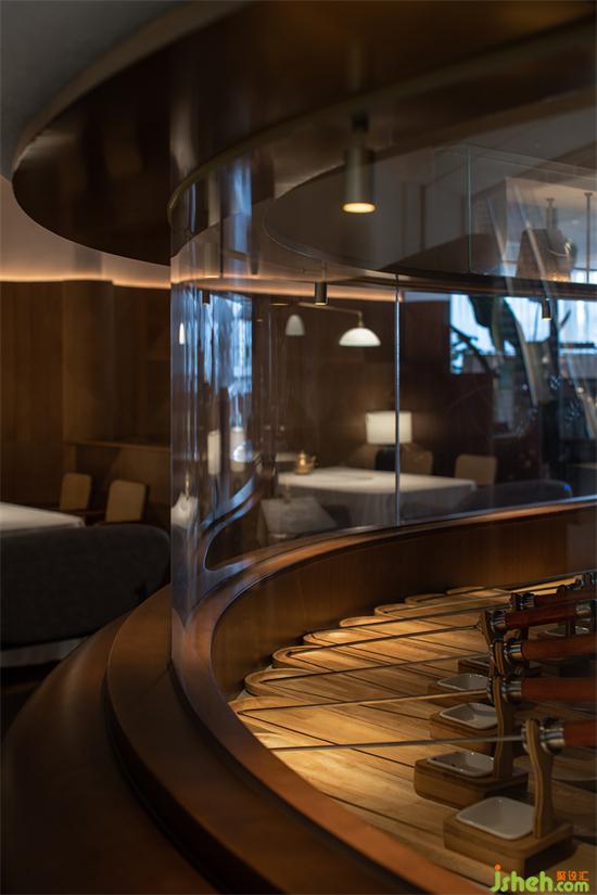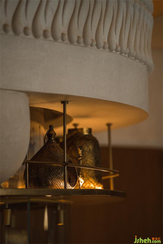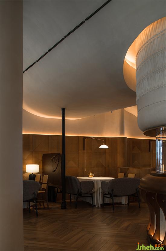 在广阔的大美新疆中,我们选择无论自然形态还是色彩都极具柔美特质及包容性的沙丘作为灵感来源,并形成空间框架结构,充满流动感的弧度如流沙般充满整个空间。运用自然(沙)的内在法则,像是叶子的脉络和羽毛,形成某种形式的旋律。餐厅设计纯正的圆形和弧度都是单调的,都不太可能引起快感,因为这一构图手段过于明显,所以我们在顶部做出可控的、难以辨认比例的弧度,在空间下半部做出符合功能尺度的均衡弧度且形成围合,创造单调和混乱适当均衡的知觉快感。