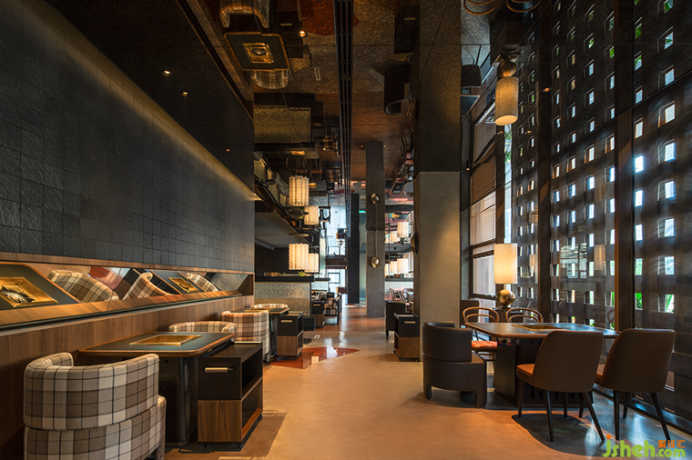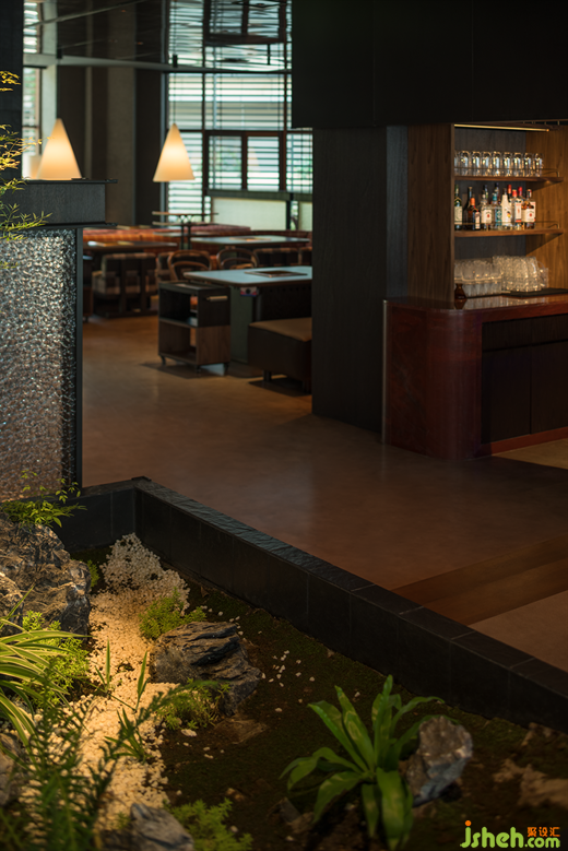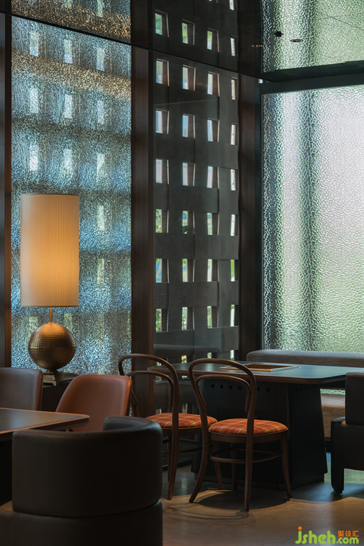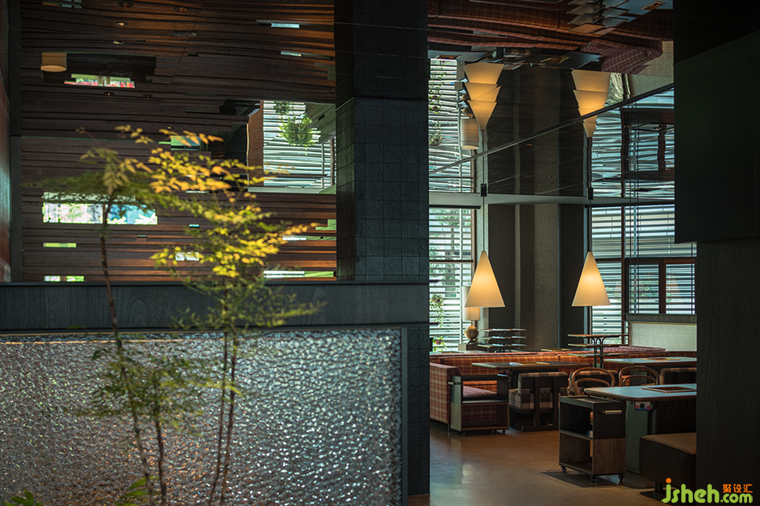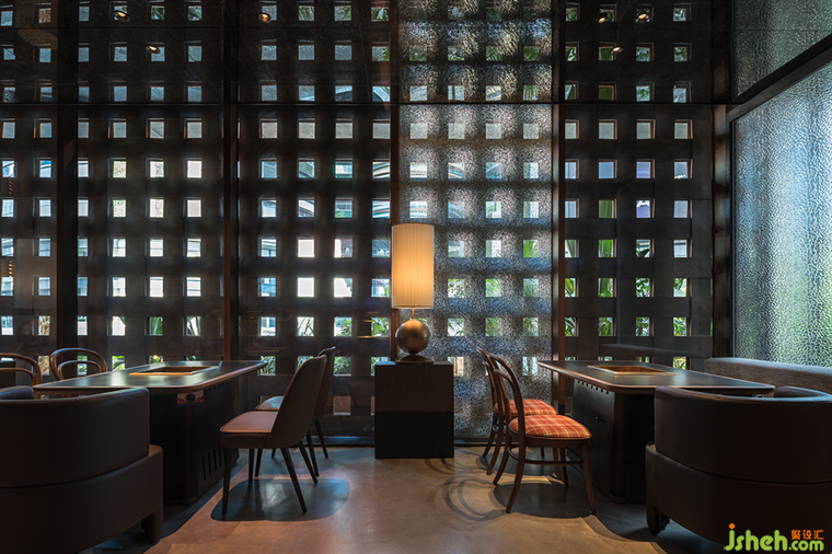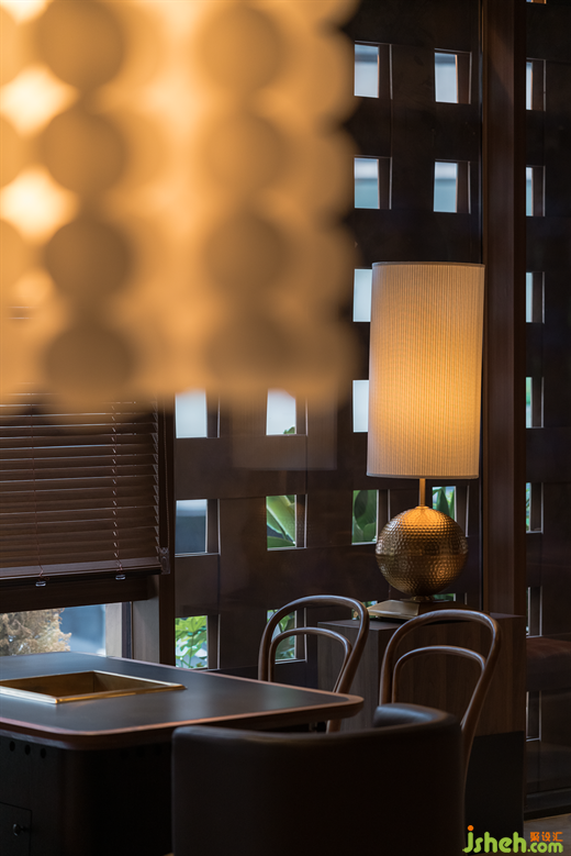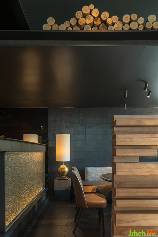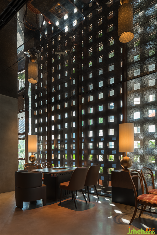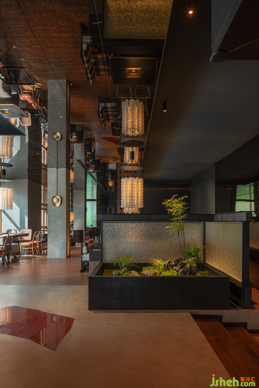 空间层次上的高低处理、多种透与不透、隔断介质的穿插, 火锅店设计超常规尺度编制隔断,仿佛捕梦网,与红色异形石材地拼、充满肌理感堆积木料、秩序感阵列吊灯形成独特的空间语言体系。类似电影的跳接剪辑、蒙太奇手法,这些手法的运用让空间带有些许电影气质,如梦如呓语的电影旁白般贯穿始终,渗透着设计师对“梦”的理解。