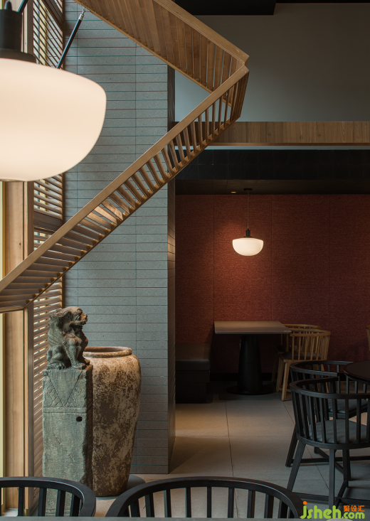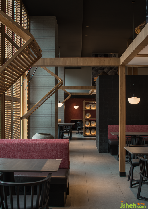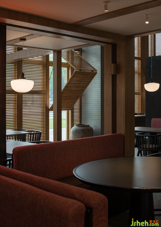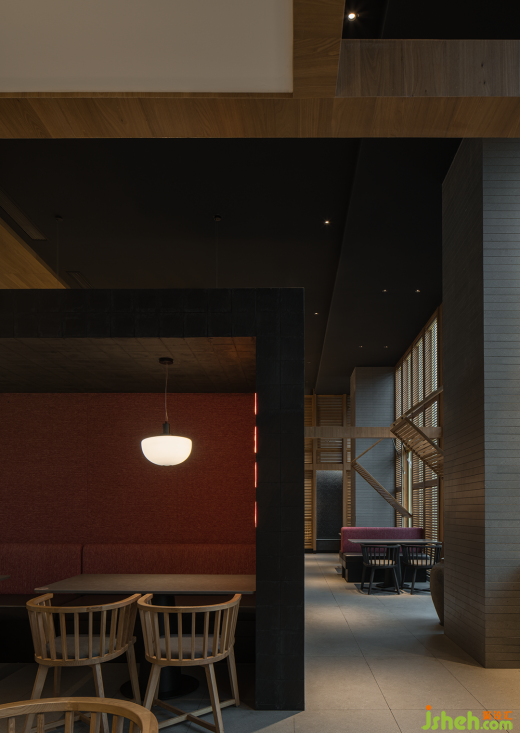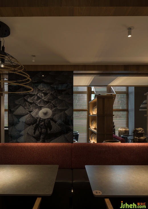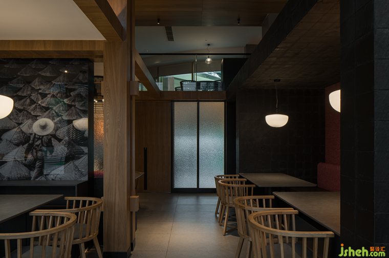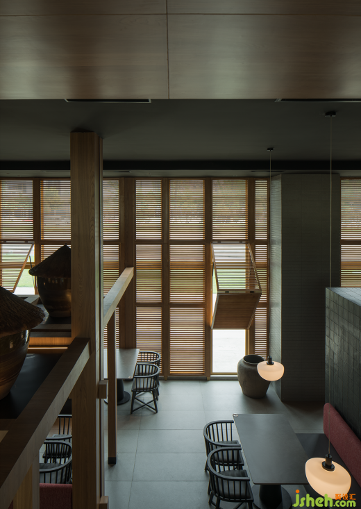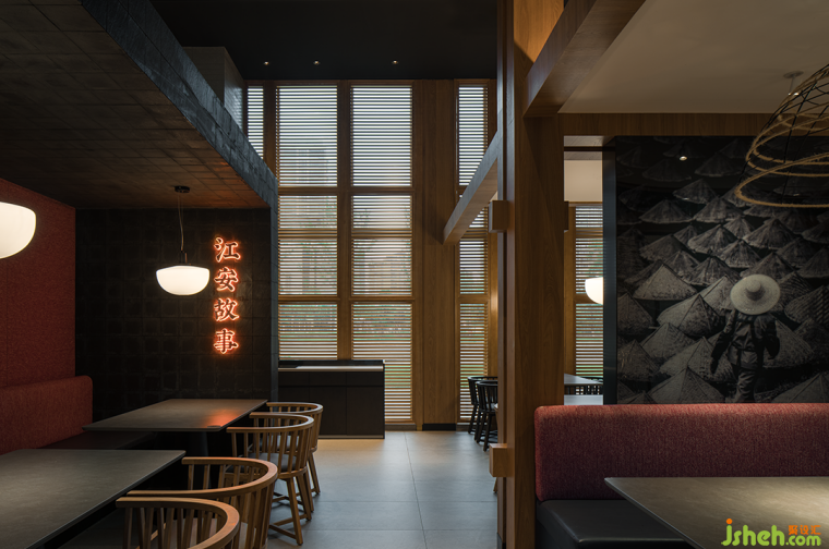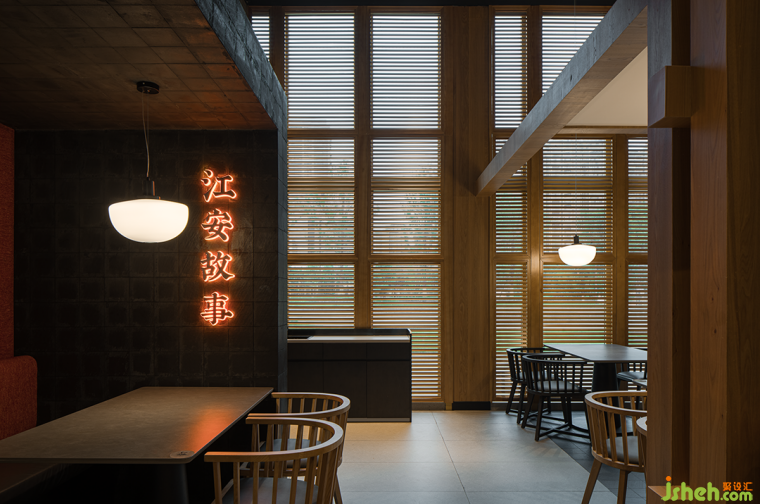 项目位于成都温江区江安河畔,地理环境优美,原始场地是偏弧形的全玻璃结构建筑。室内面积1050㎡,整体玻璃展面达40米,梁下层高4.9米左右,无疑项目本身的展面、视野、采光都是很好的,但随之带来的问题是日照过强的时候靠玻璃面几乎无法入座,项目自身功能需求如厨房、包间、卫生间形成的体块关系可以解决一部分遮挡,配合质朴、烟火气的品牌基调,我们用可折叠木格栅窗来解决大厅遮阳问题,无阳光时质朴宁静,烈日下光影强烈、氛围感十足。