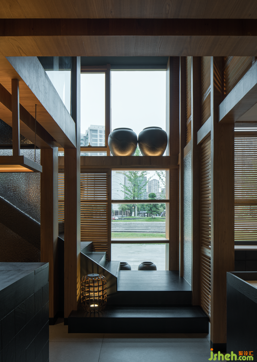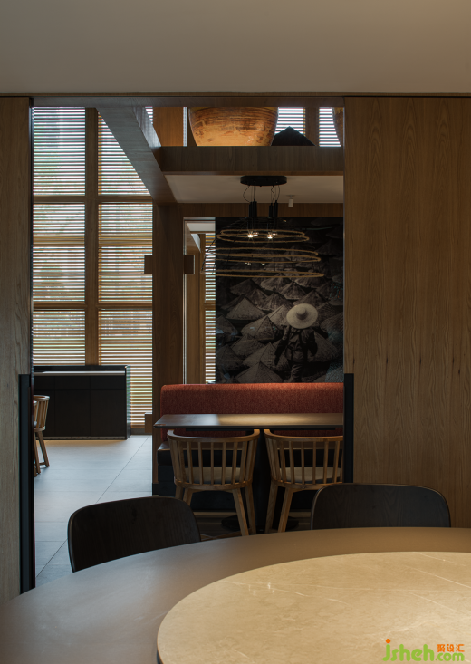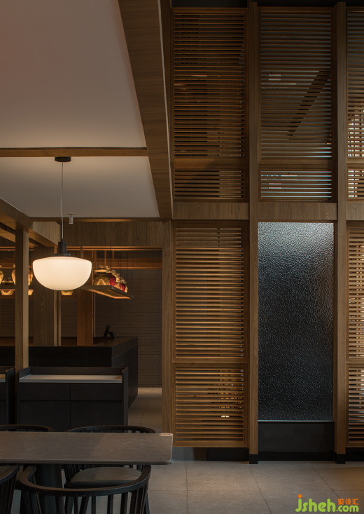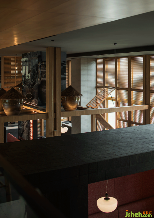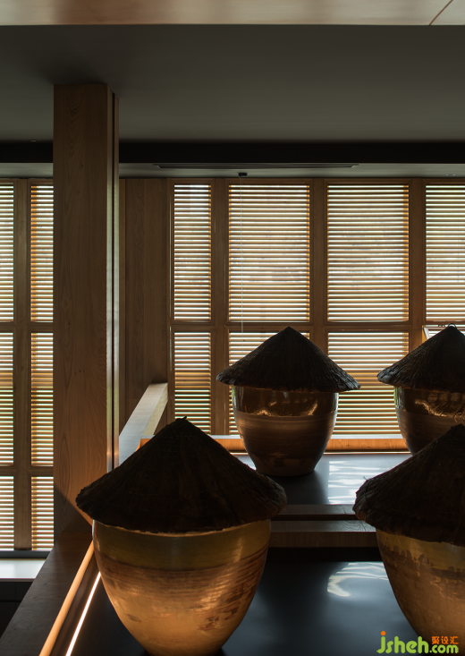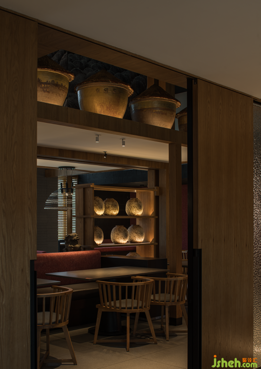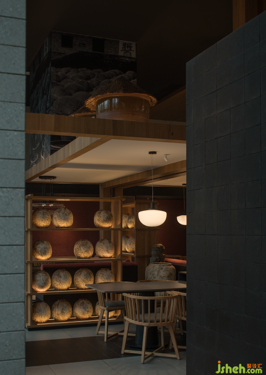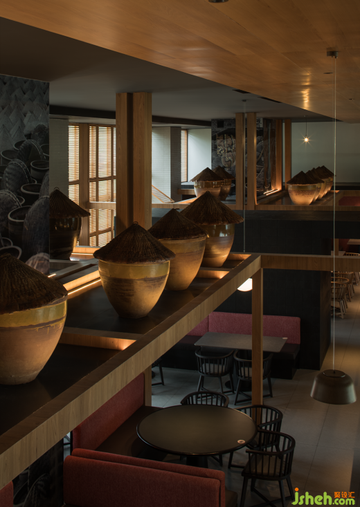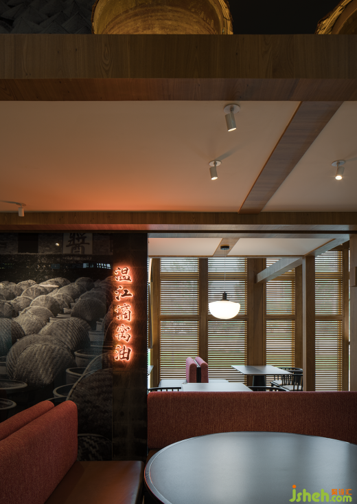 选择部分搭建不仅解决场地过于空旷不聚气的问题,也因搭建形成的柱网及平台形成非常巧妙的滴窝油坛展示区域(滴窝油是温江特产,每个温江人的童年记忆),一楼大厅座位之上的搭建区域,不涉及食客入座就餐,陈列滴窝油缸及滴窝油酿造的摄影照片,座位排列也通过陈列架、照片墙这种固定模块摆放形式的变幻而变得不同,这种区别于传统的平面布局方式,给食客非常围合、私密的体验但又能感受到整个大厅热闹的就餐氛围,让整个空间疏密有致,有趣且耐人寻味。以这种新的设计形式来承载项目的定位需求。